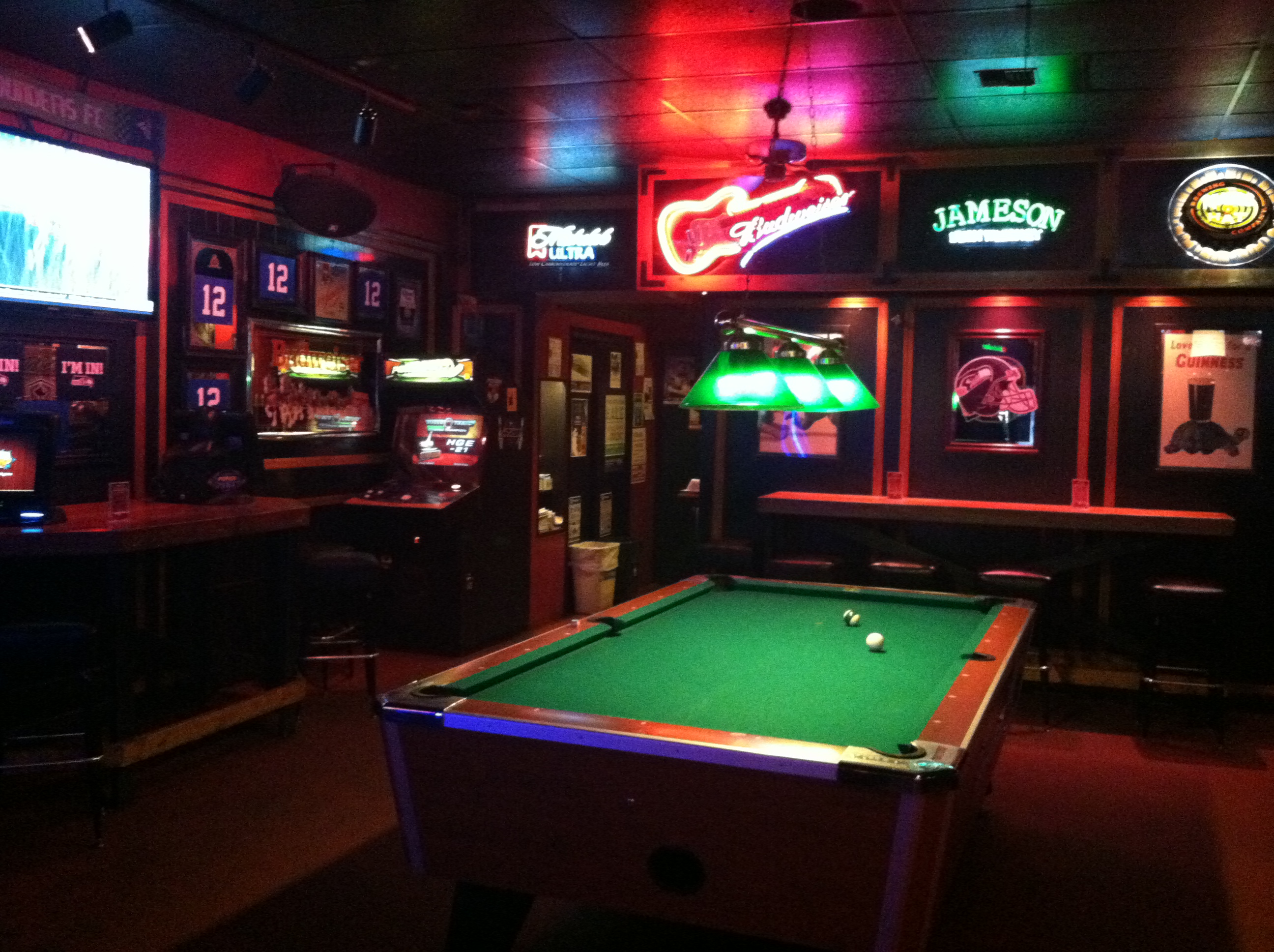 Description: A pool table in a room with neon signs and a neon sign on the wall above it and a neon sign on the wall.