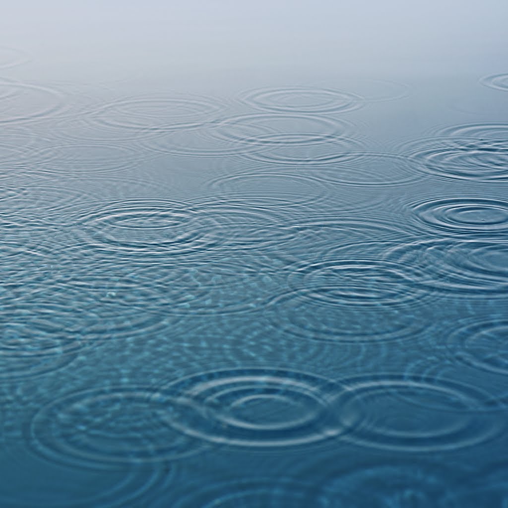 Description: A pool with a lot of water and circles on it's surface and a blue sky in the background.