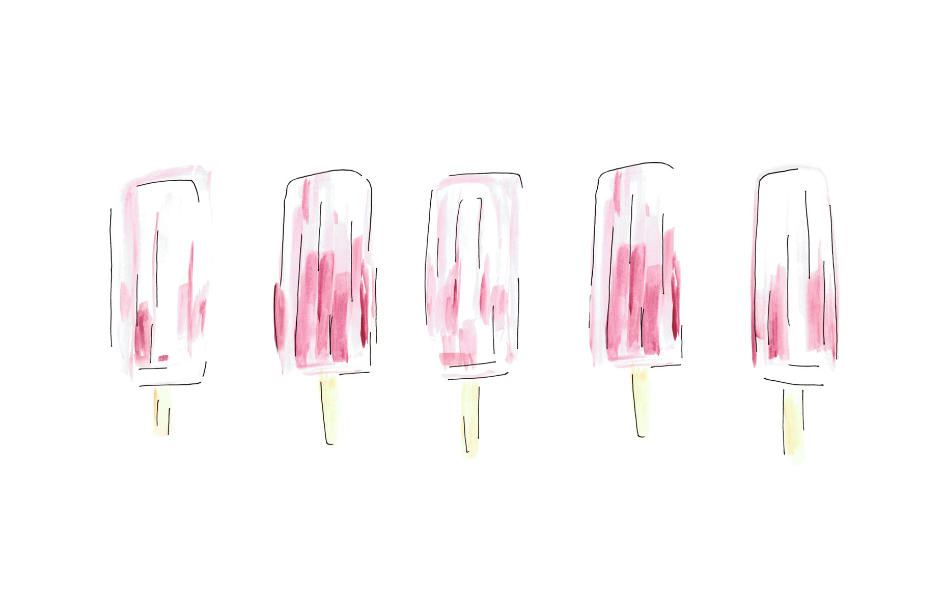 Description: A drawing of four popsicles with pink and yellow toppings on them.