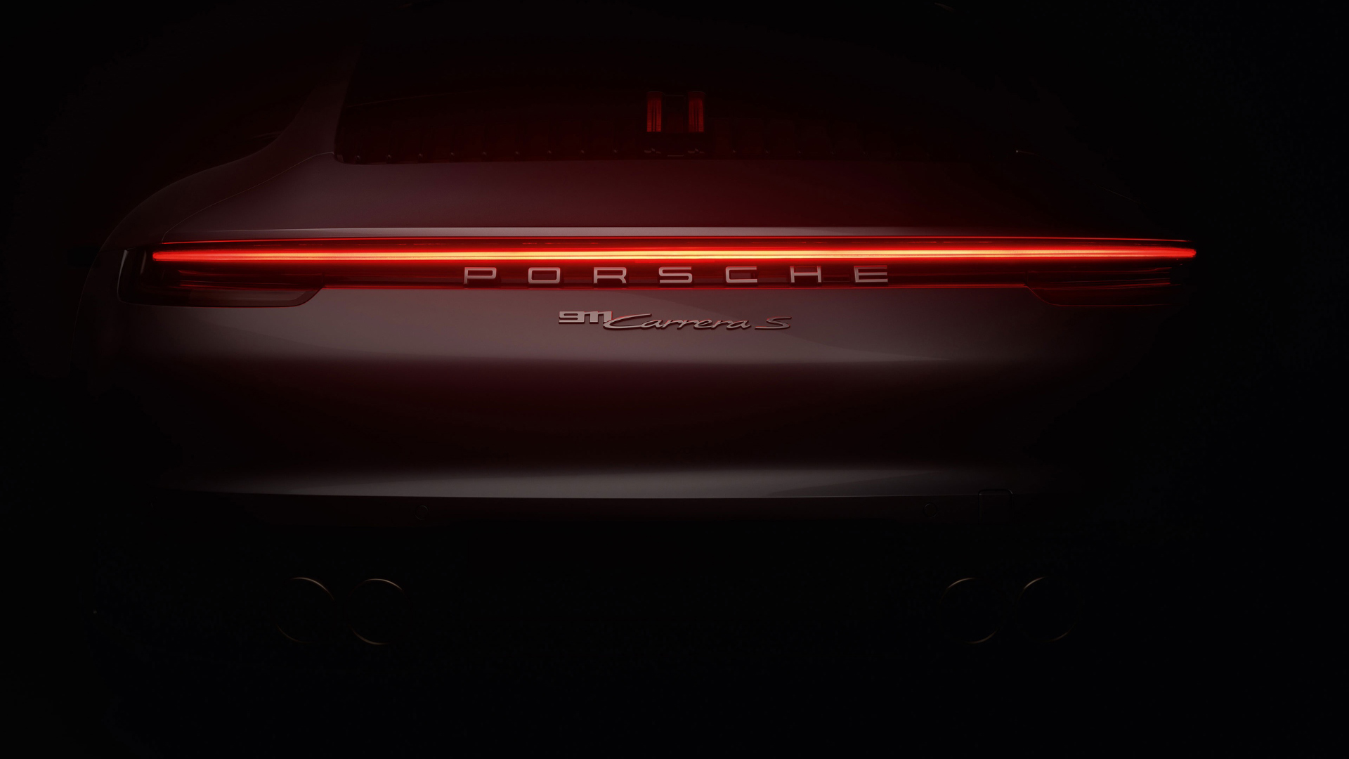 Description: The back end of a porsche suv in the dark with its tail light on and the word porsche on the side.