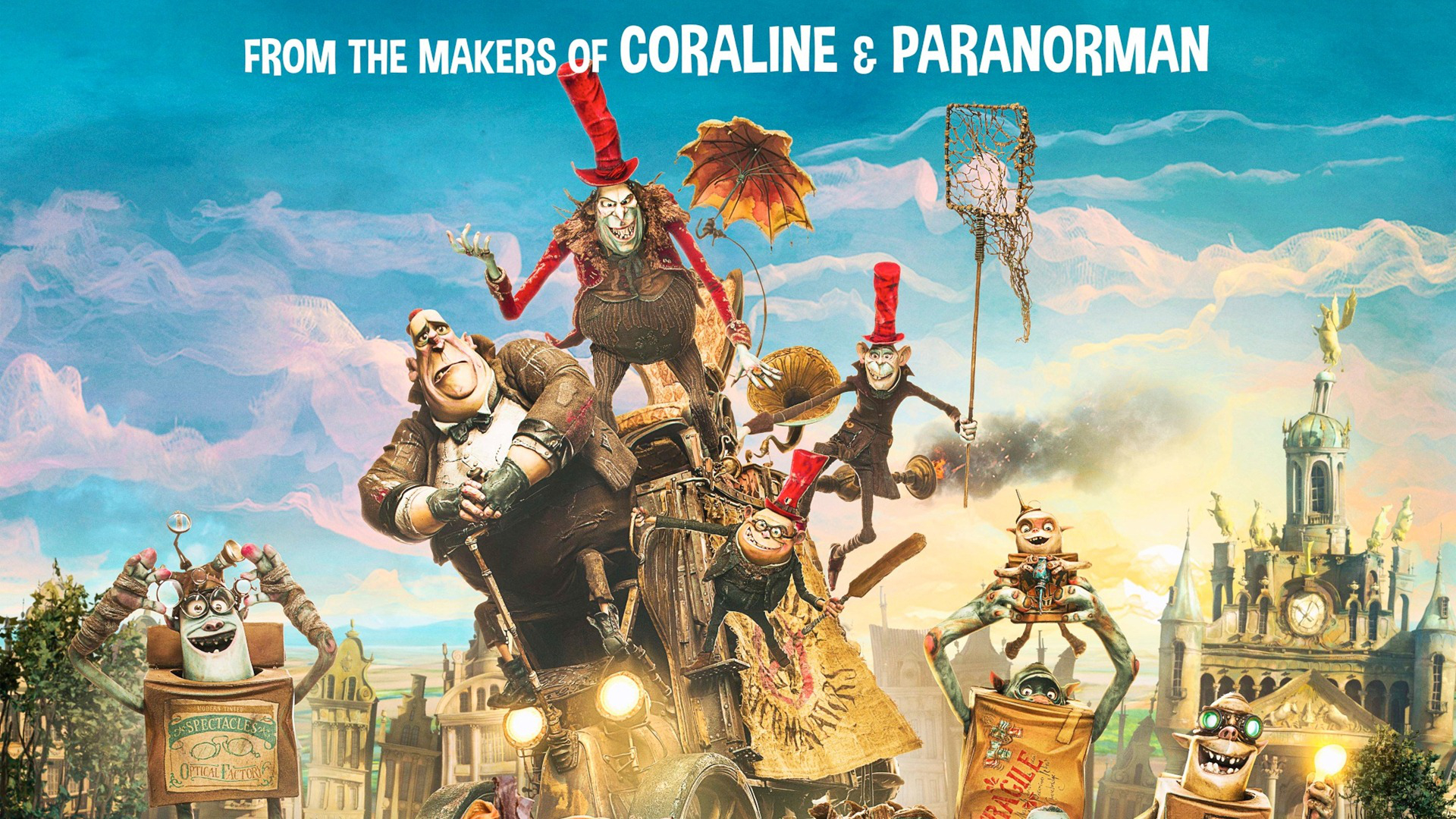 Description: A poster of a group of people riding on top of a horse in front of a castle with a clock tower.