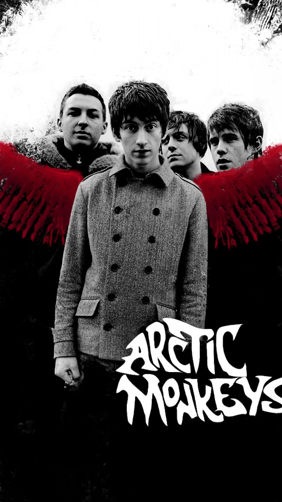 Description: A poster of a group of people with wings on a black background with a red wing in the middle.