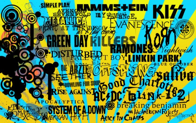 Description: A poster with a lot of different words on it's side and a sunburst in the background.