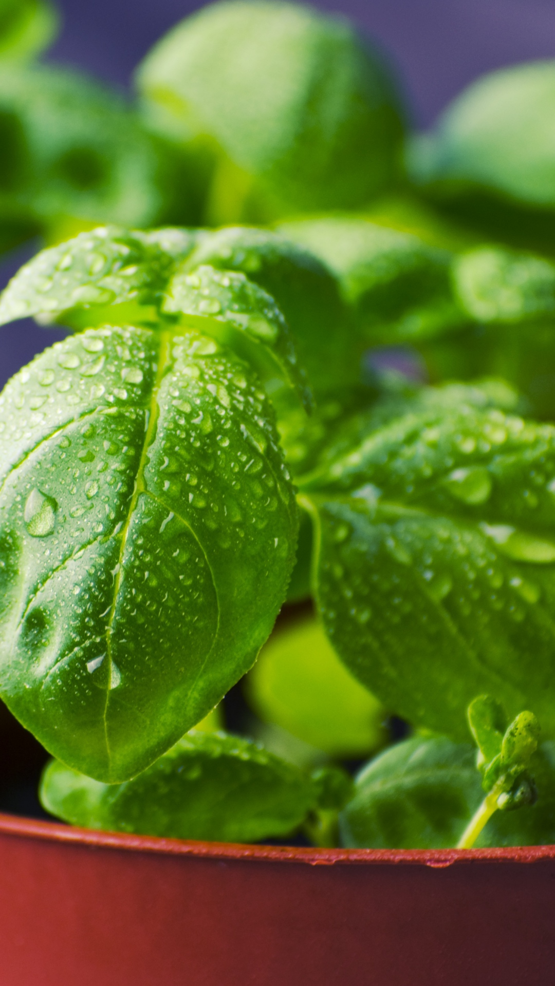 Description: A potted plant with water droplets on it's leaves and leaves are shown in the background.