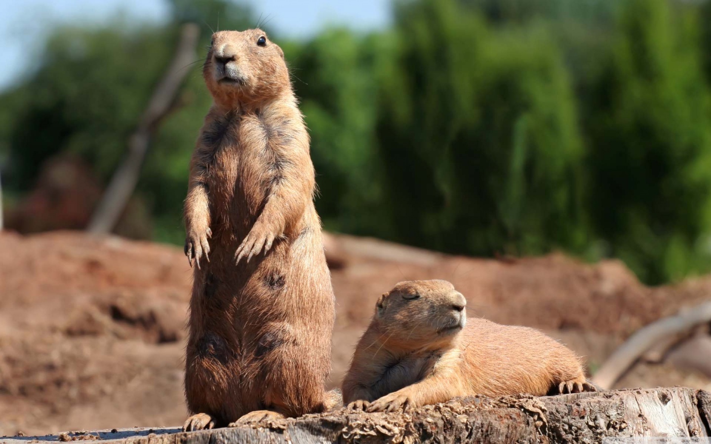 Description: Two prairie groundhogs standing on their hind legs on a log in a zoo enclosure with trees in the background.