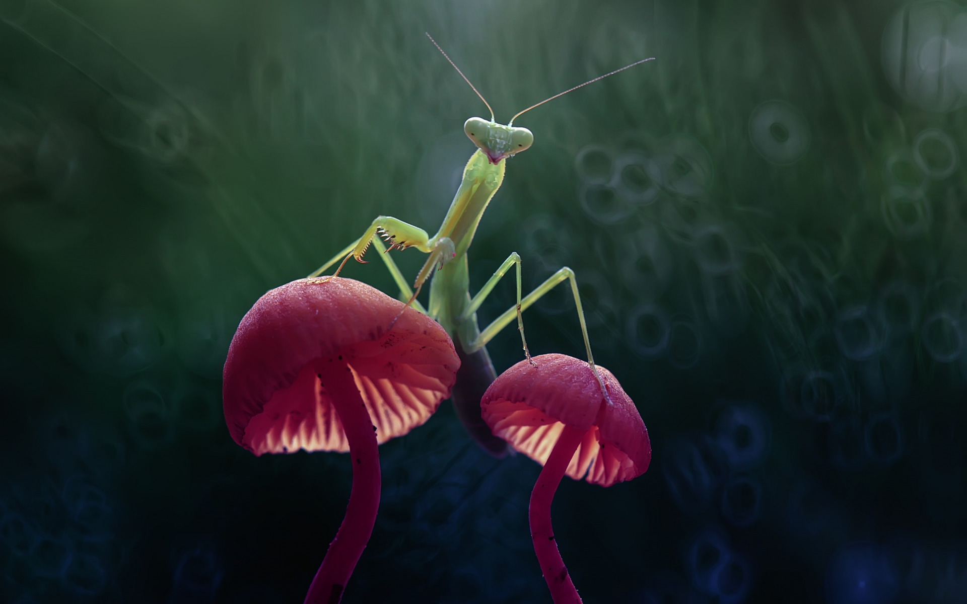Description: A praying mantissa sitting on top of a red flower with a green background and a blurry image of a mantissa.