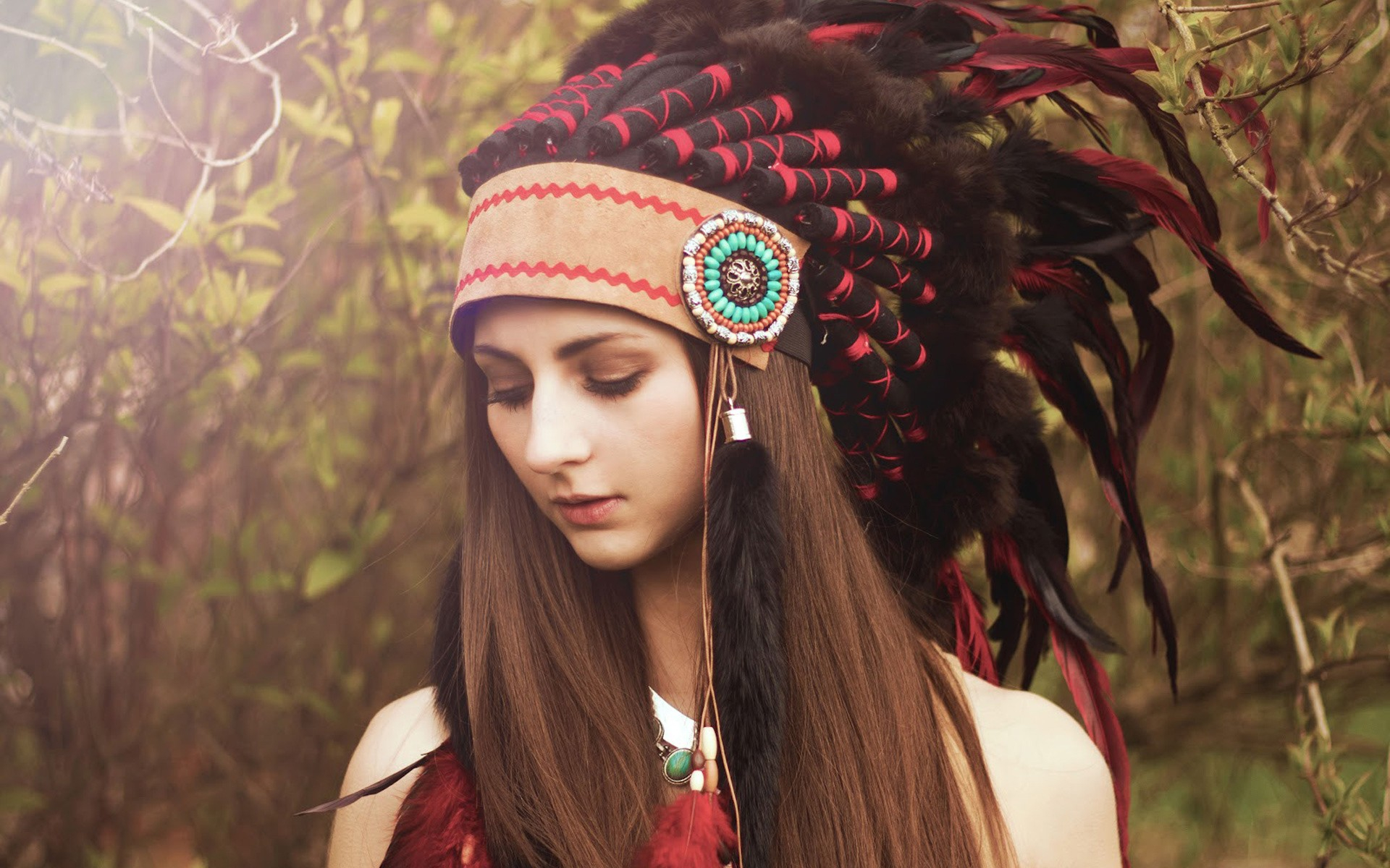 Description: A woman wearing a headdress with feathers and beads on her head and a feathered headdress.