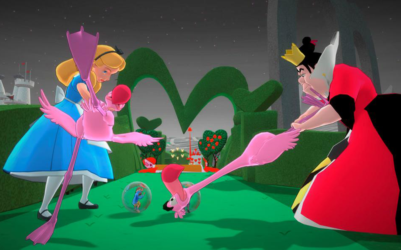 Description: A cartoon of a princess and a frog playing with a ball in a park at night time with a castle in the background.