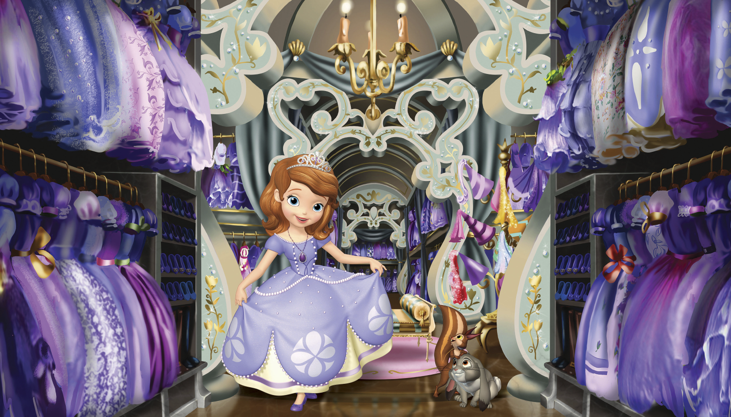 Description: A cartoon of a princess in a purple dress in a store with a dog and a cat in front of her.