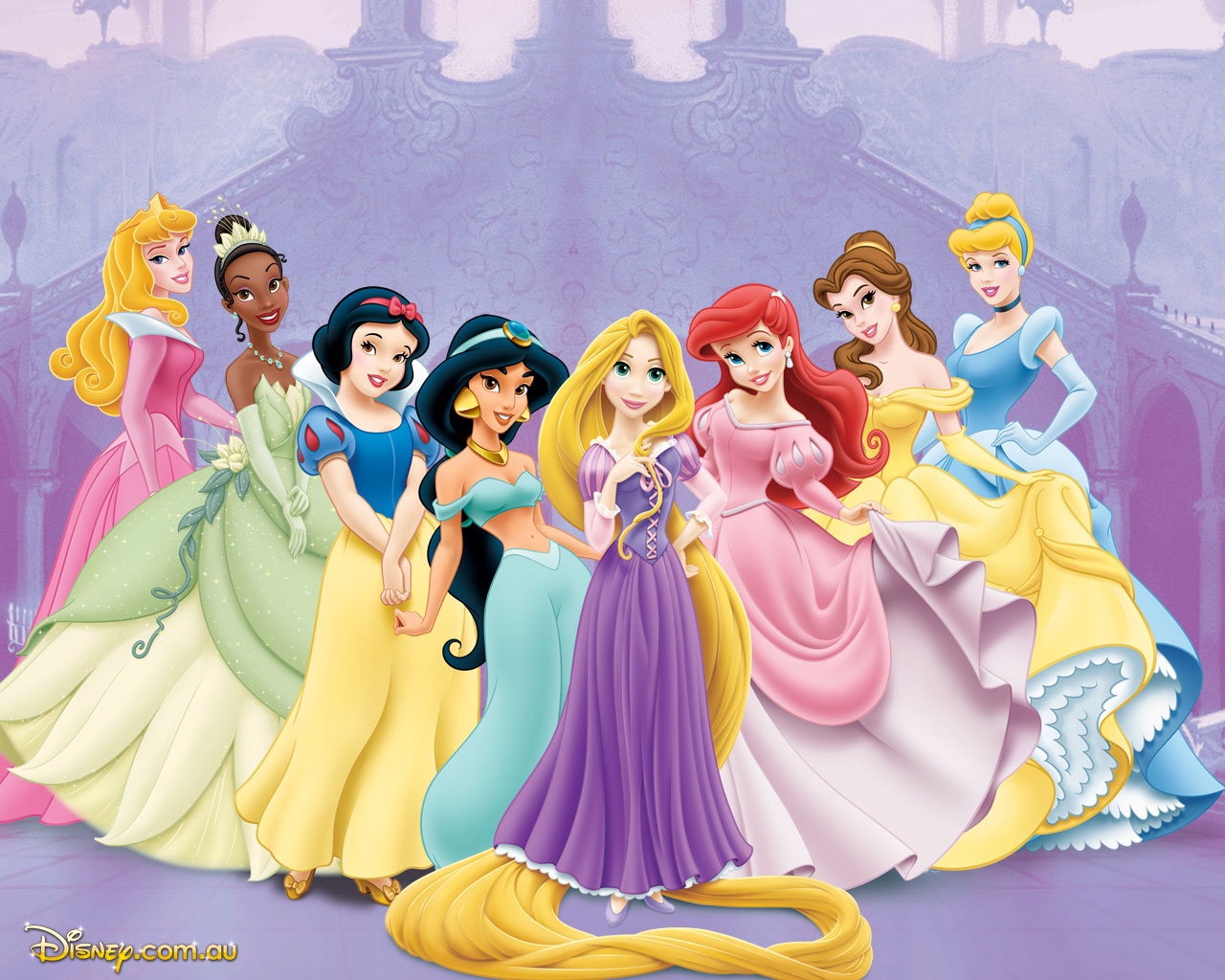Description: A group of princesses standing in front of a castle with a dragon in the foreground and a dragon in the background.