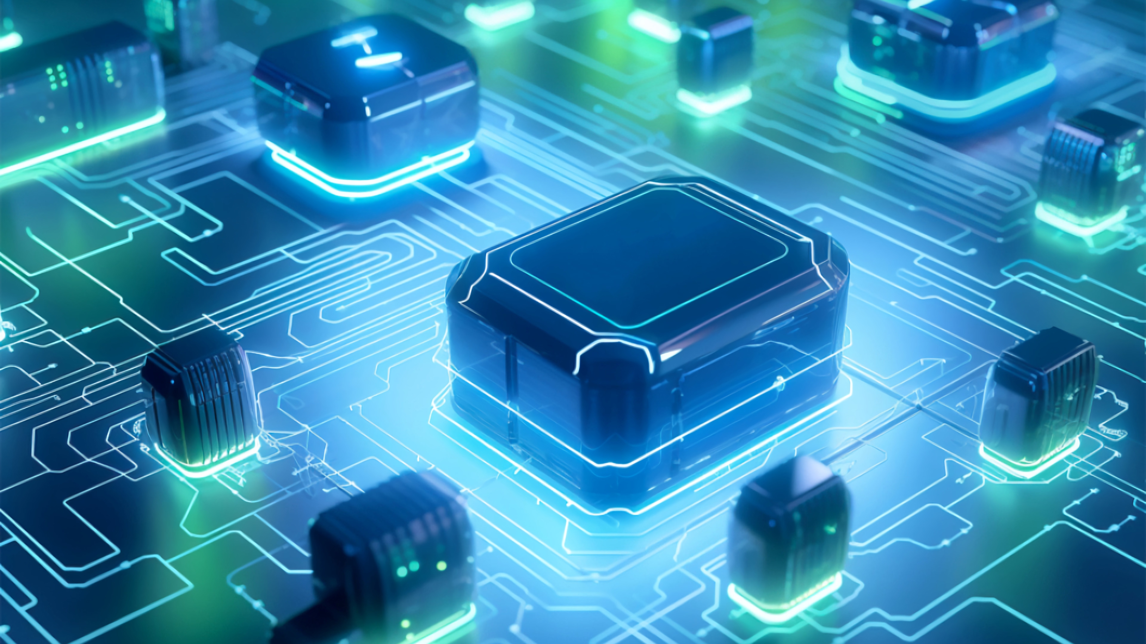 Description: A computer processor with glowing lights on it's side and a blue background with a black square on top.