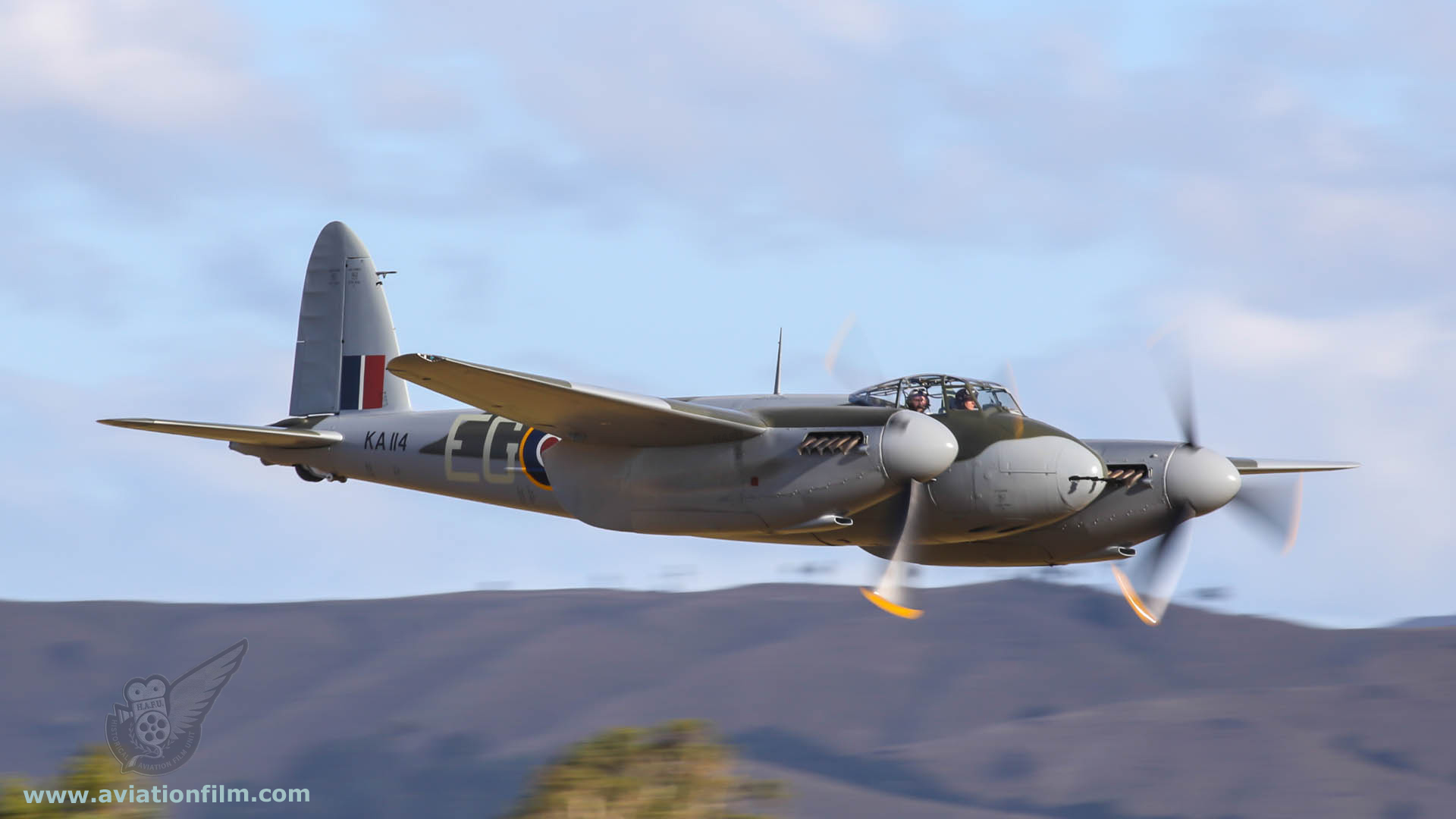 Description: A propeller plane flying through the air with mountains in the background and clouds in the sky above it.
