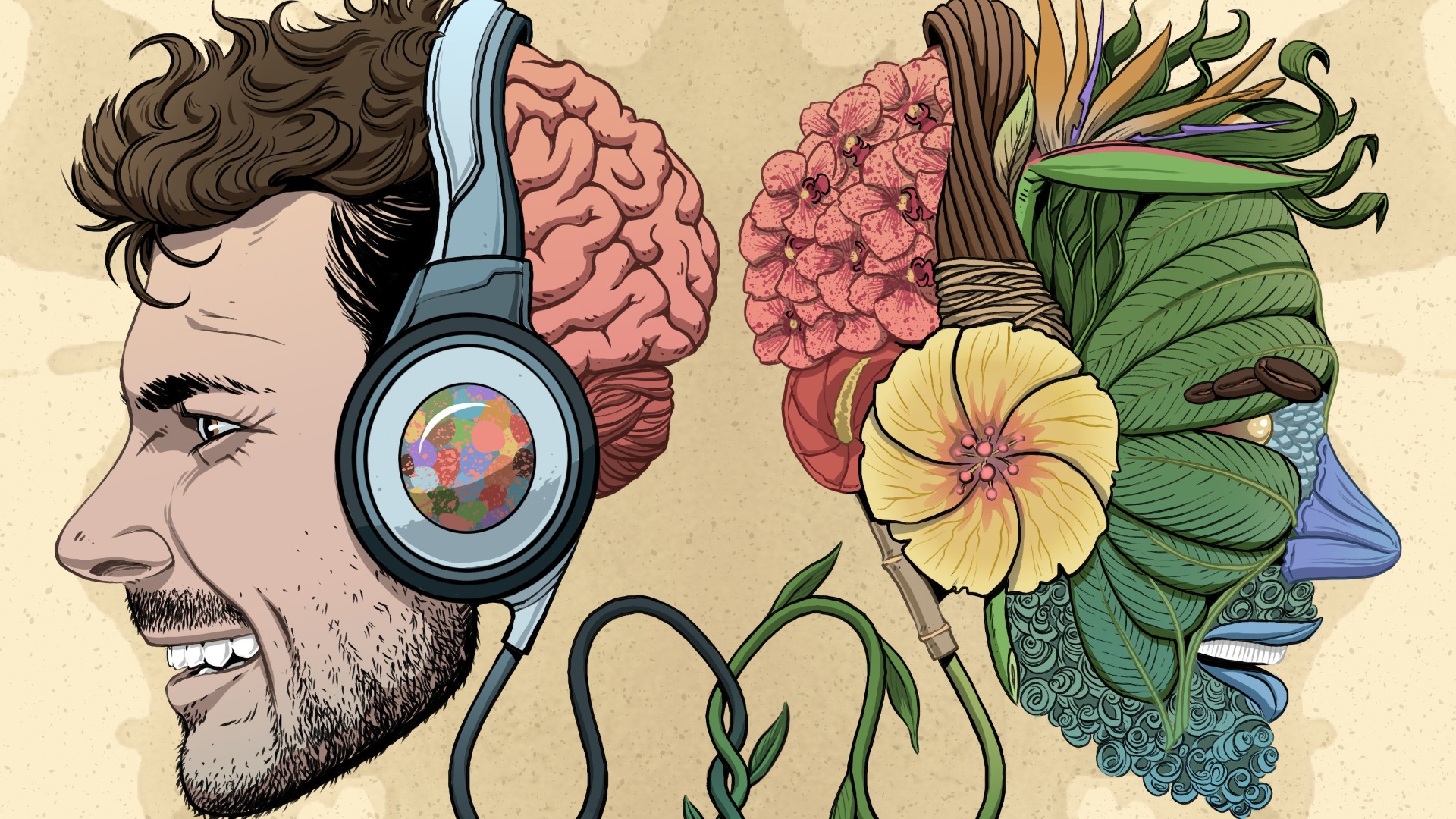 Description: A man with headphones on and a flower in his ear and a drawing of a human brain behind him.