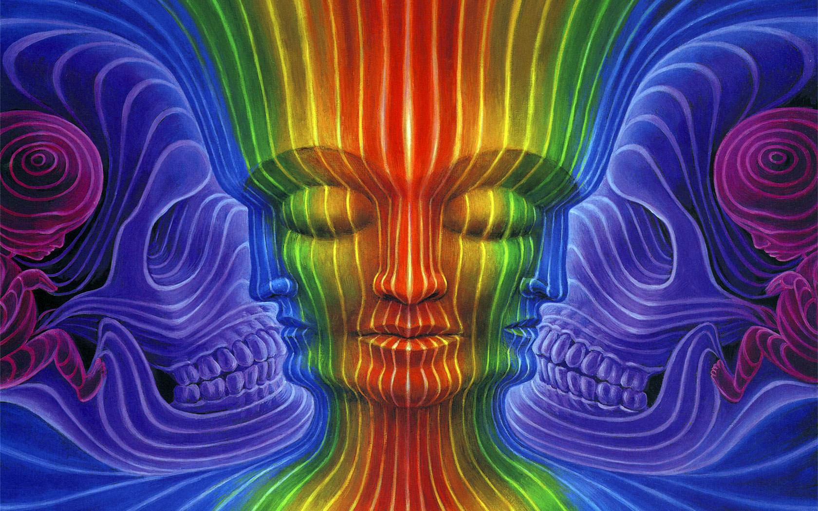 Description: A psychedelic image of a man with his eyes closed and his head in the center of the image is a rainbow - hued image of a human face.
