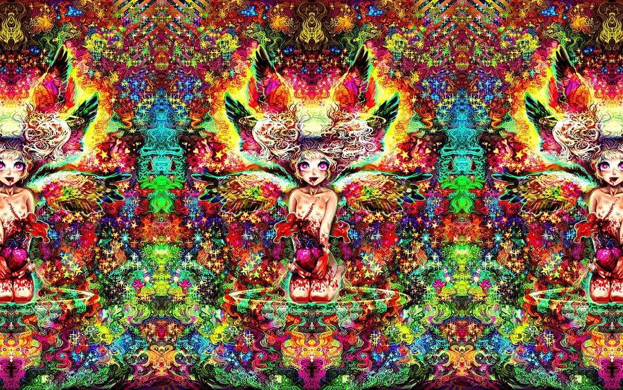 Description: A psychedelic image of a woman with a rainbow hair and a butterfly wings on her head and body.