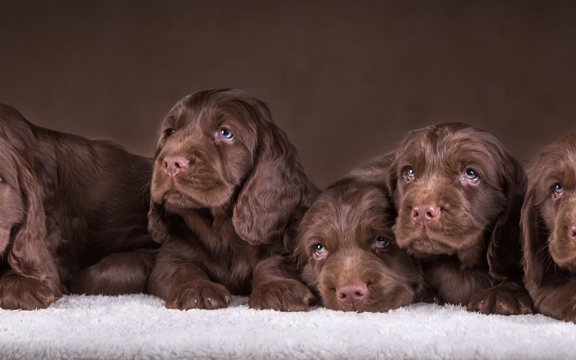 Description: A group of puppies sitting next to each other on a white blanket in front of a brown background.