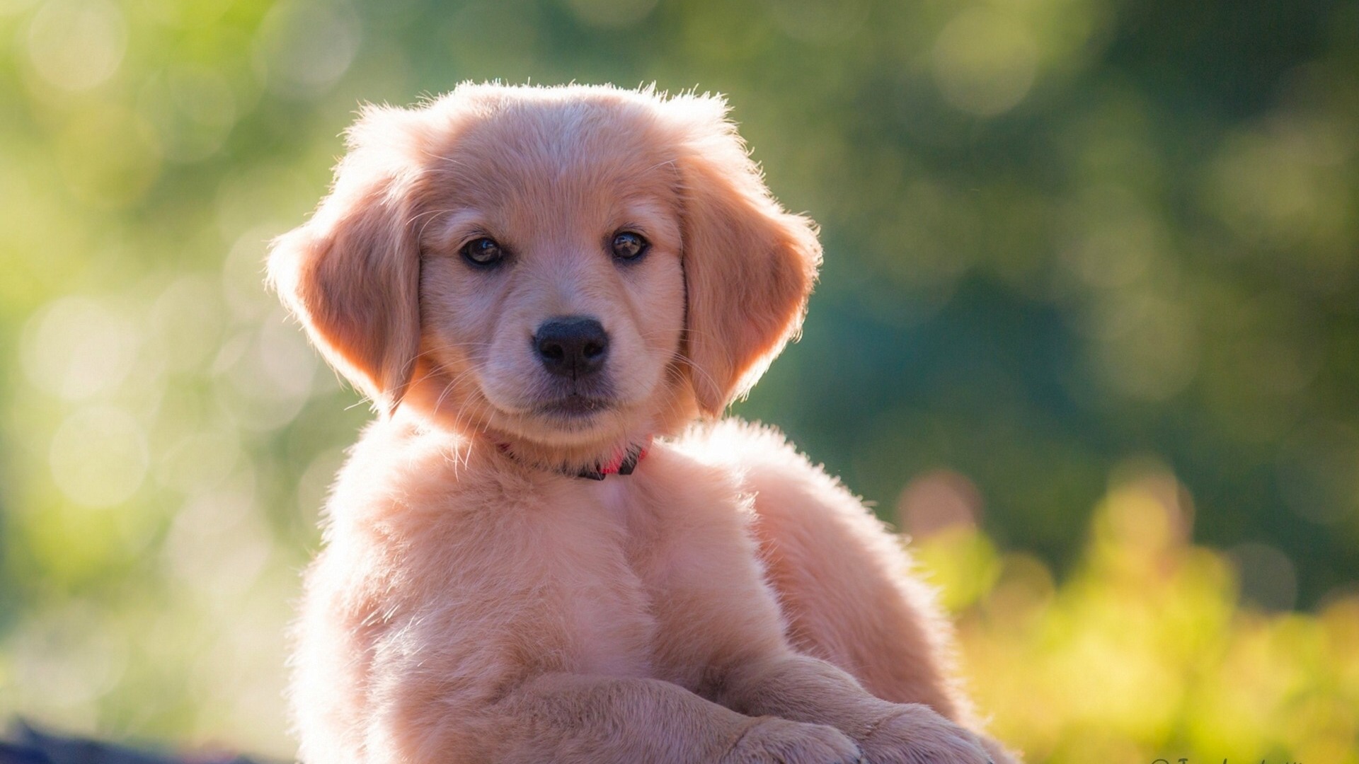 Description: A puppy sitting on a log with a blurry background of trees and grass in the background.