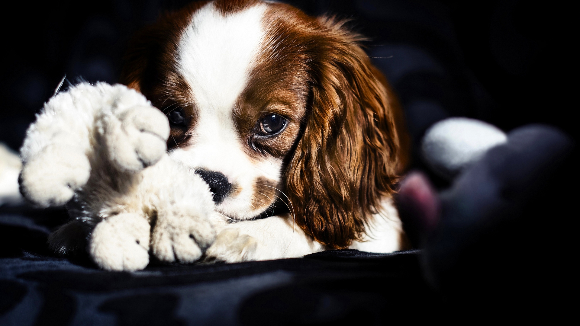 Description: A puppy playing with a stuffed animal toy on a bed in the dark with a black background and a black blanket.