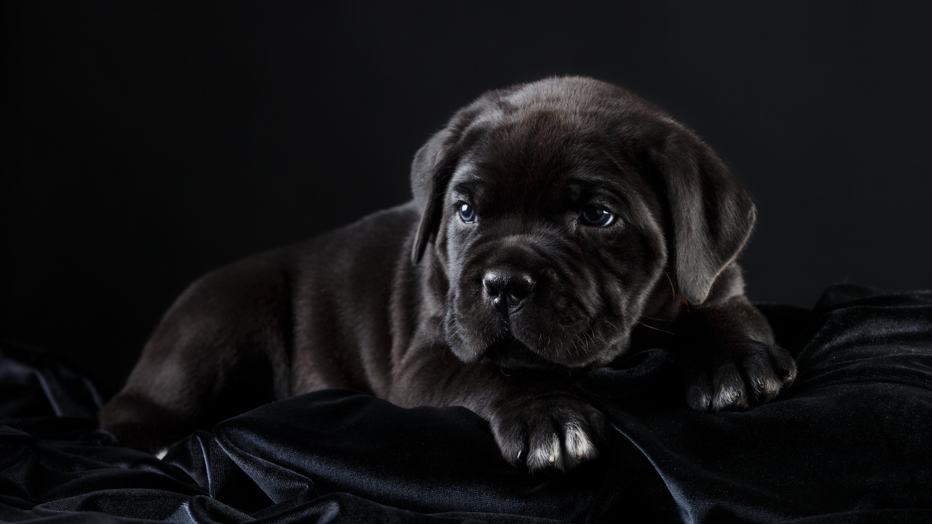 Description: A puppy is laying down on a black blanket looking at the camera with a sad look on his face.