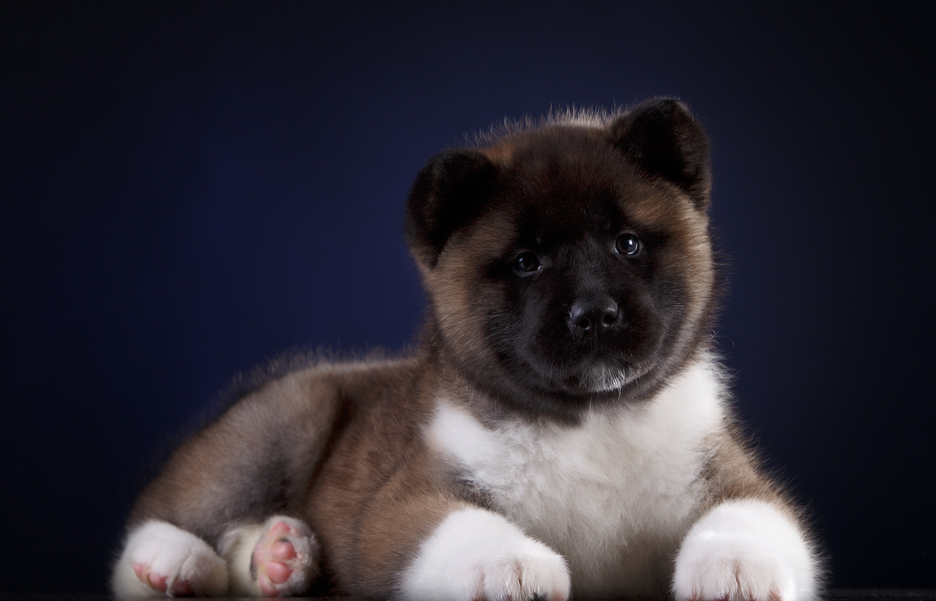 Description: A puppy is sitting on a table and looking at the camera with a sad look on his face and paws.