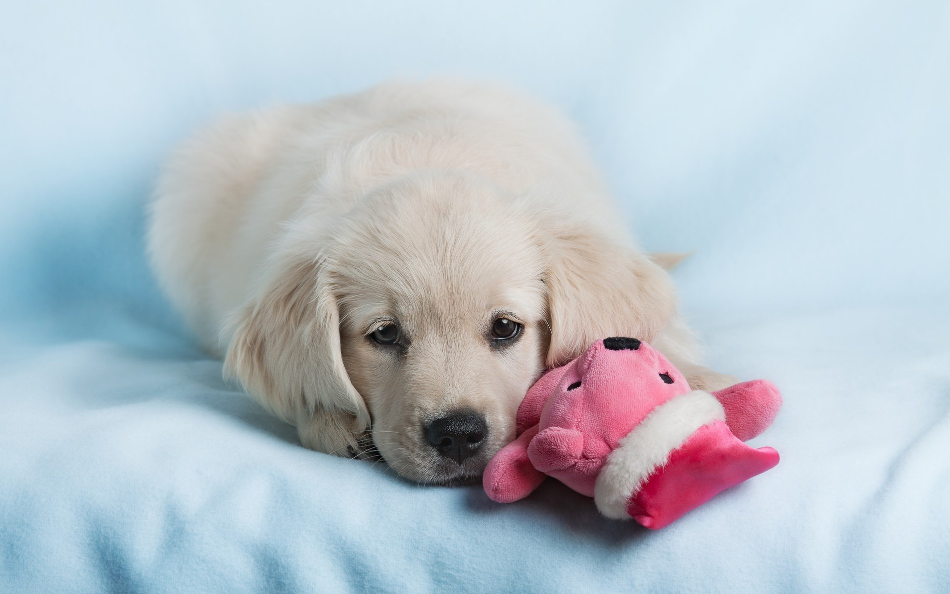 Description: A puppy laying on a bed with a stuffed animal toy in its mouth and a blue blanket behind it.
