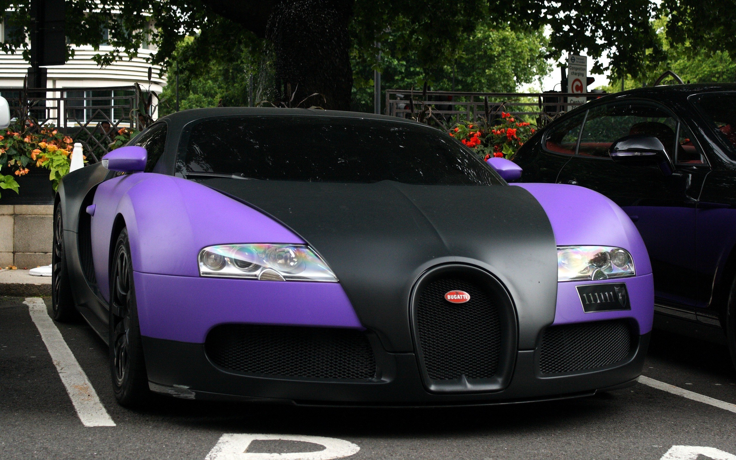 Description: A purple and black bugatti parked in a parking lot next to a black car and a black car.