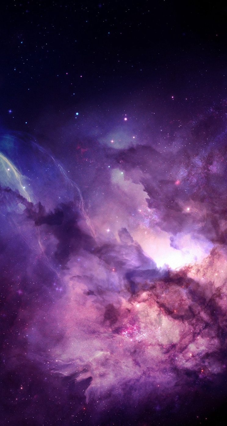 Description: A purple and blue space filled with stars and clouds with a bright green light at the end of the image.