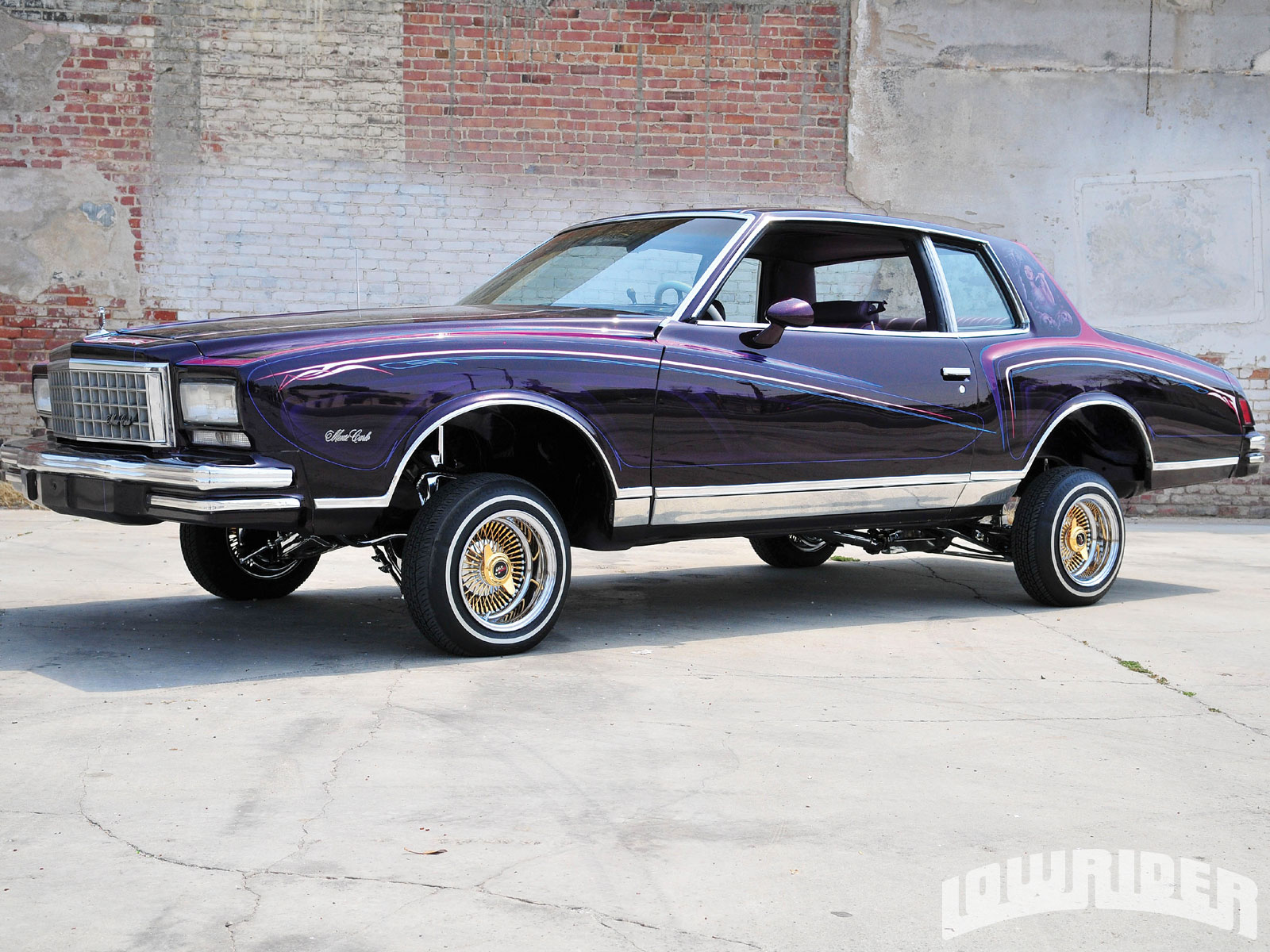 Description: A purple car parked in front of a brick wall with a brick wall behind it and a brick wall behind it.