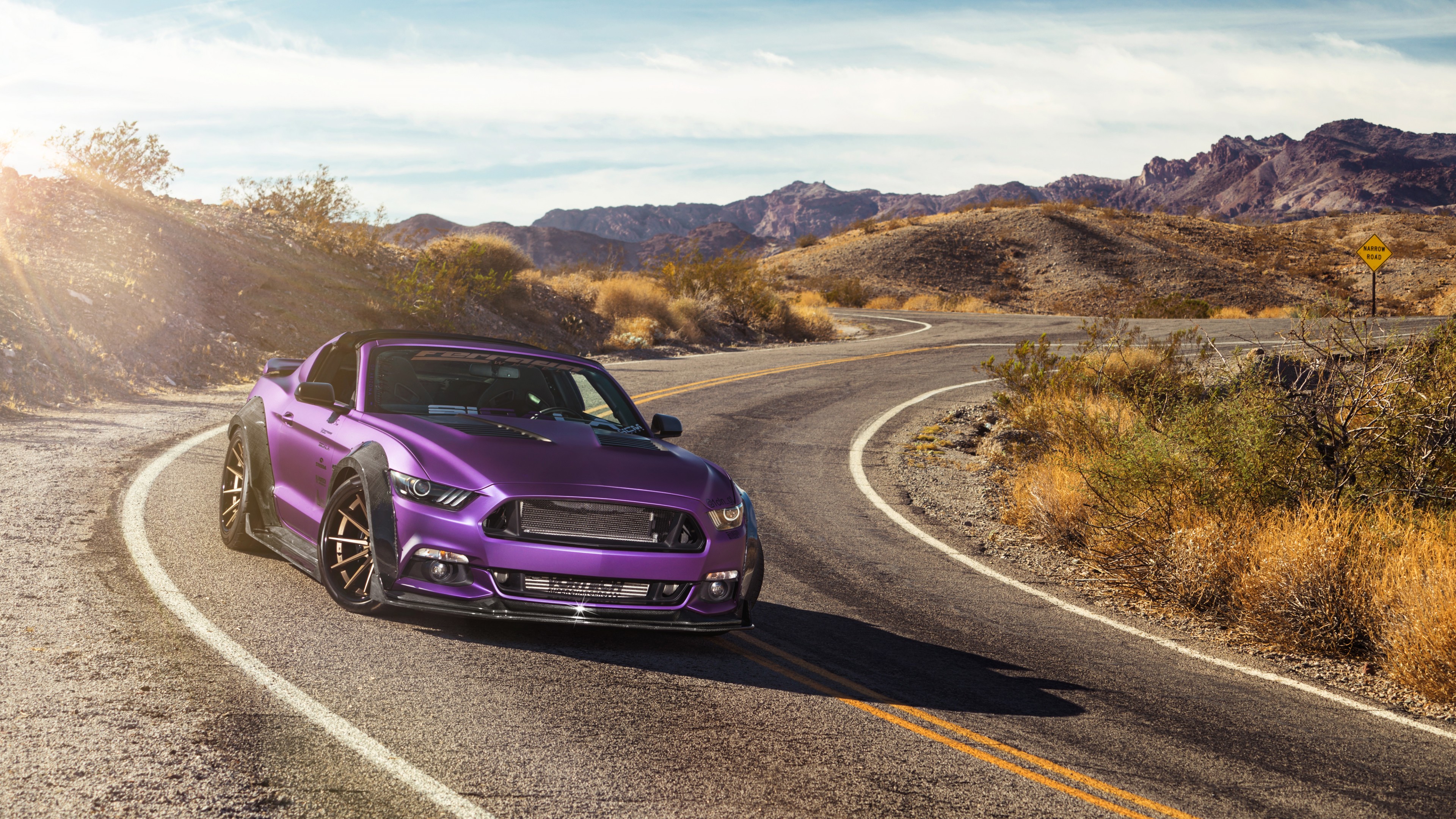 Description: A purple car driving down a road in the desert with mountains in the background and a sunbeam in the sky.