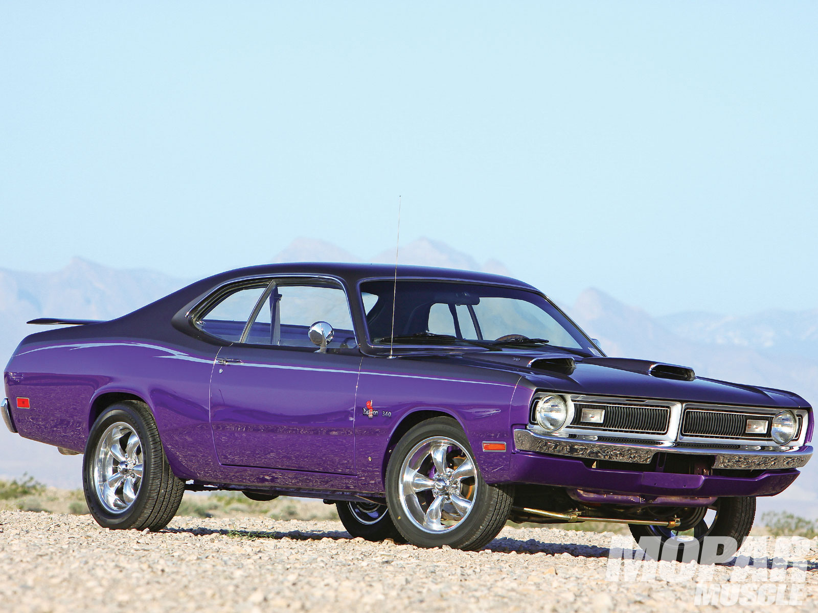 Description: A purple car parked on a gravel road in the desert with mountains in the background and a blue sky.