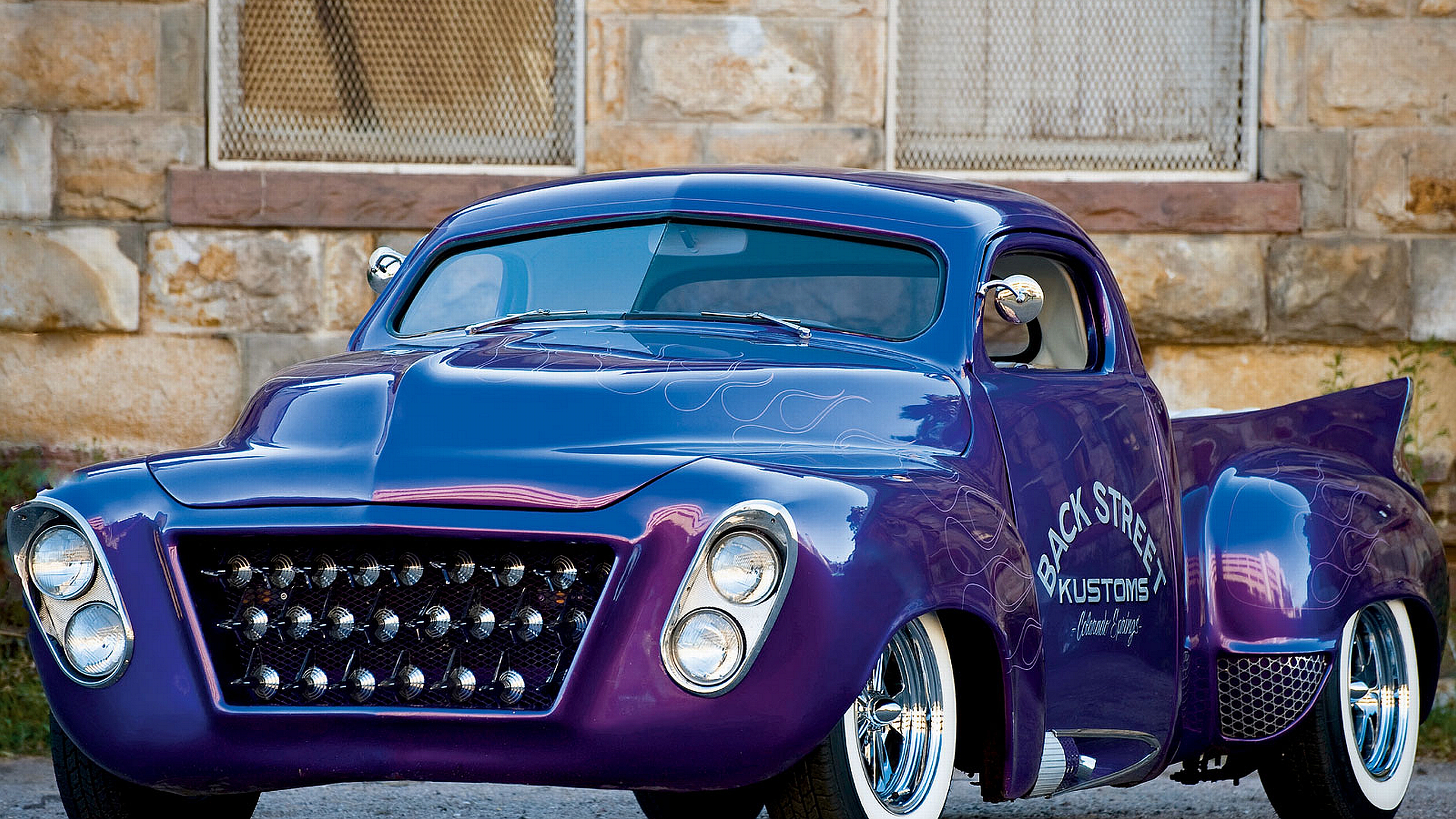 Description: A purple car parked in front of a building with a window on the side of it's side.