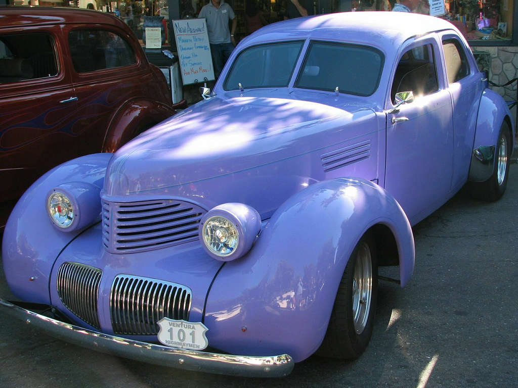 Description: A purple car parked next to a red car on a street next to a building with a sign on it.