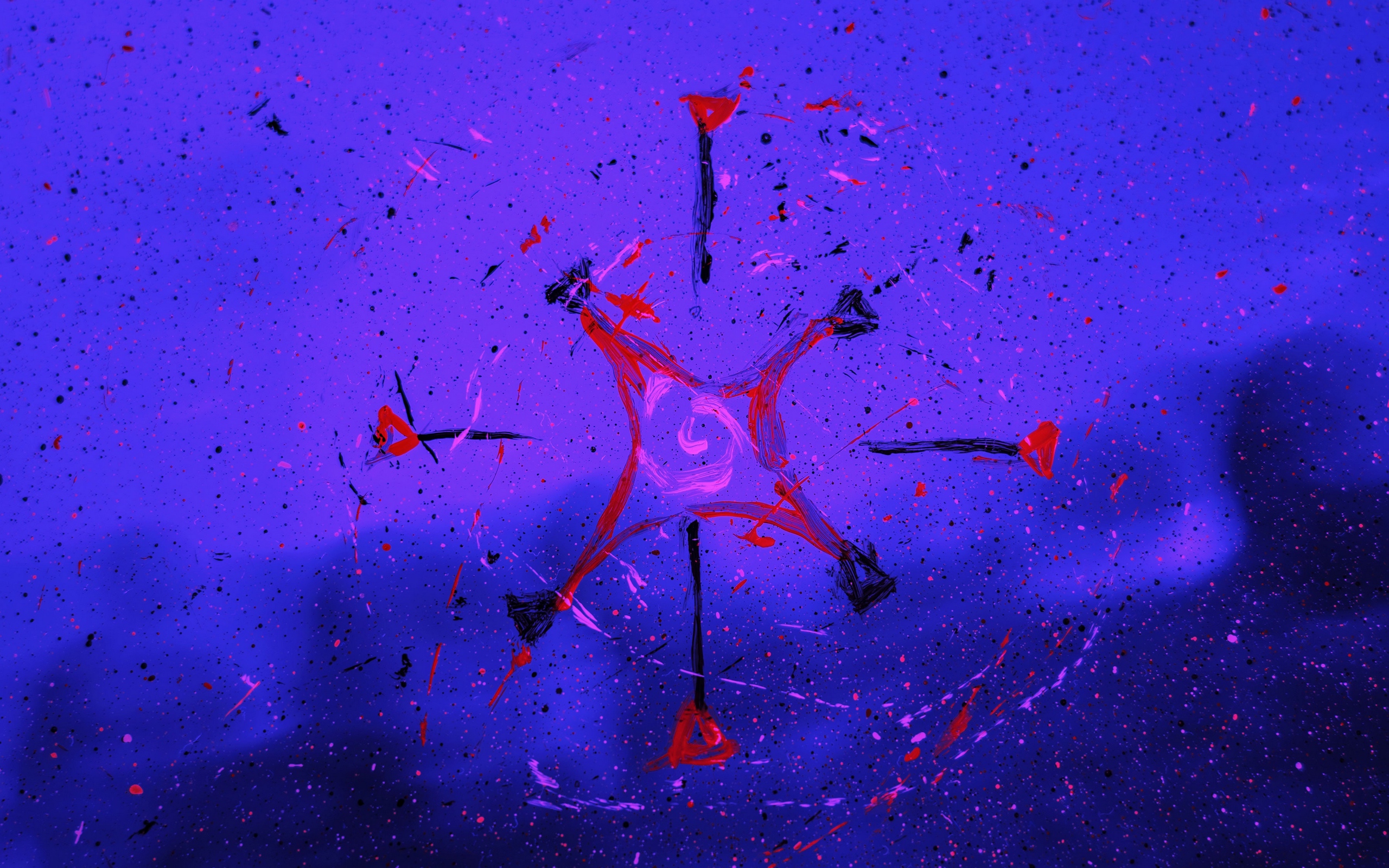 Description: A clock with a purple background and a red clock face on it's side and a blue background.