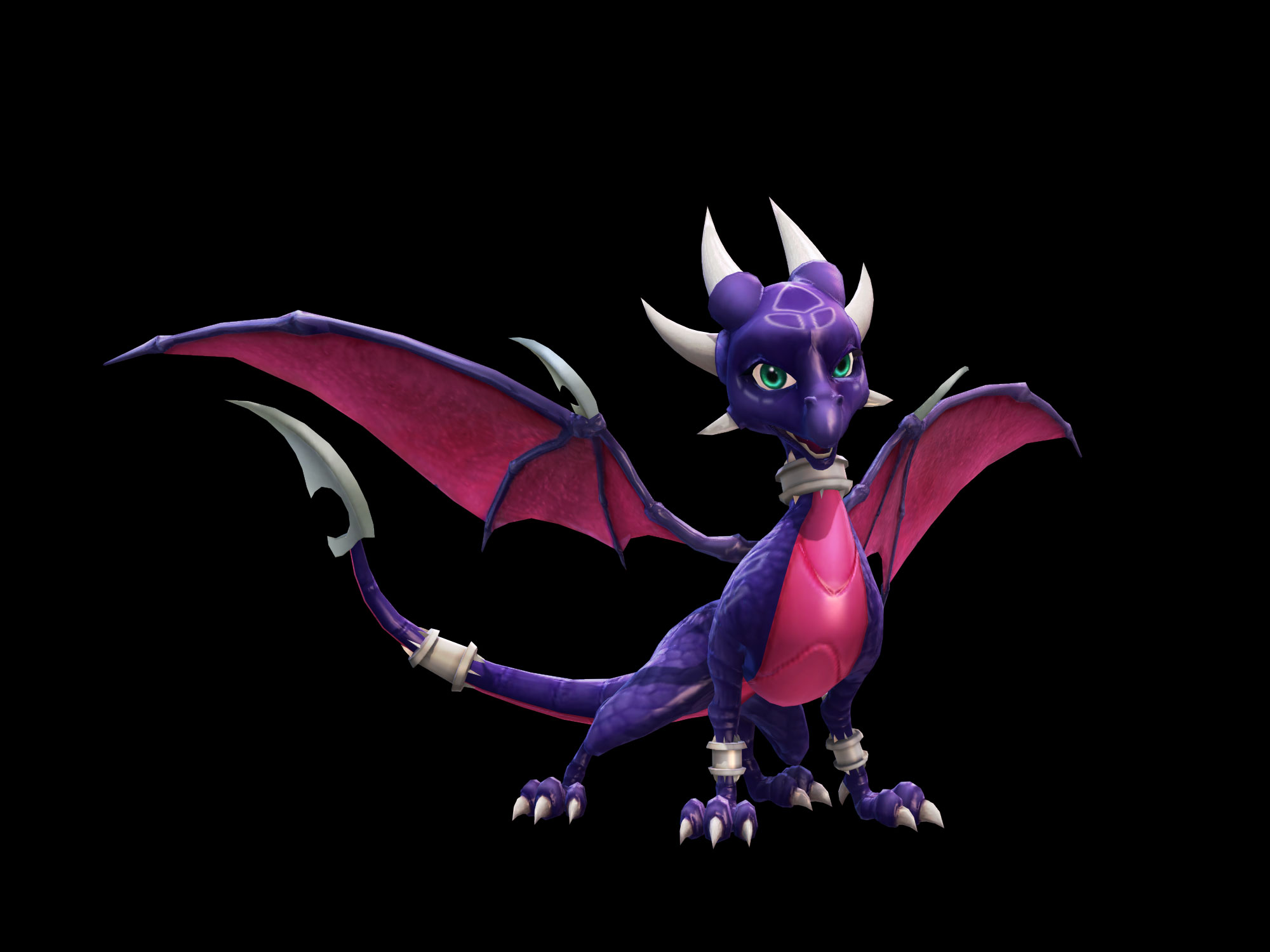 Description: A purple dragon with horns and a collar on it's back legs and wings spread out.