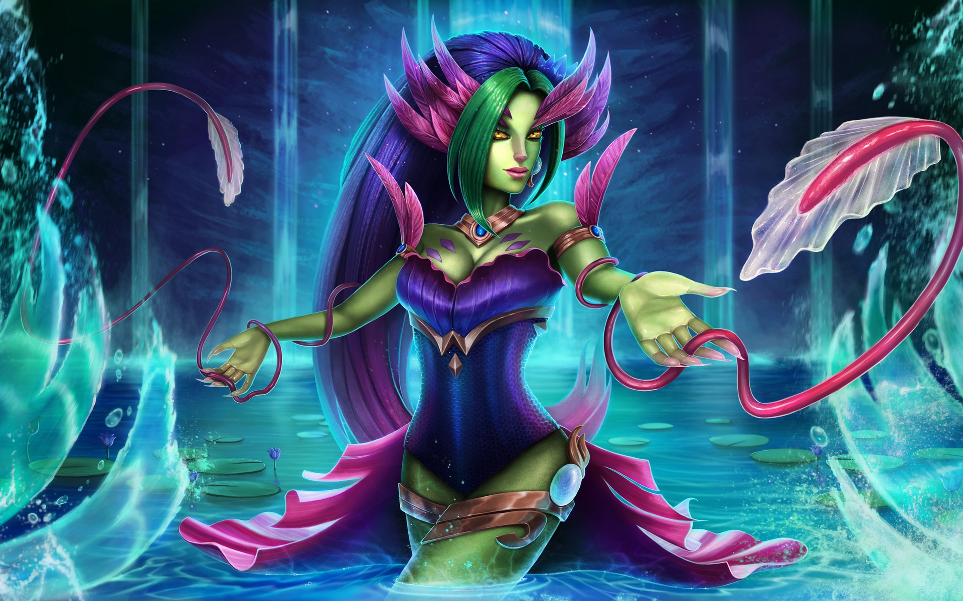 Description: A woman in a purple dress standing in water with a dragon tail on her head and a dragon tail on her arm.