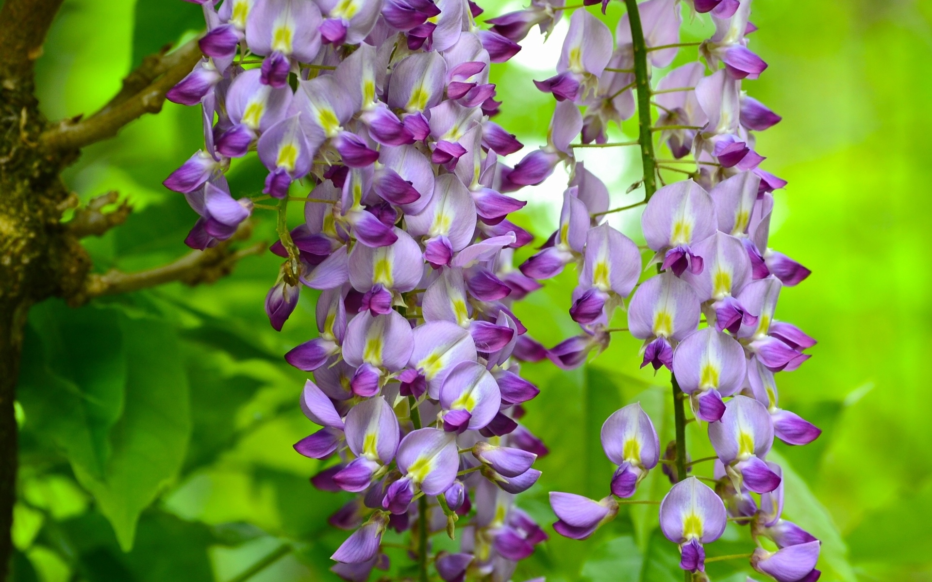 Description: A bunch of purple flowers hanging from a tree branch in a forest with green leaves and a blurry background.