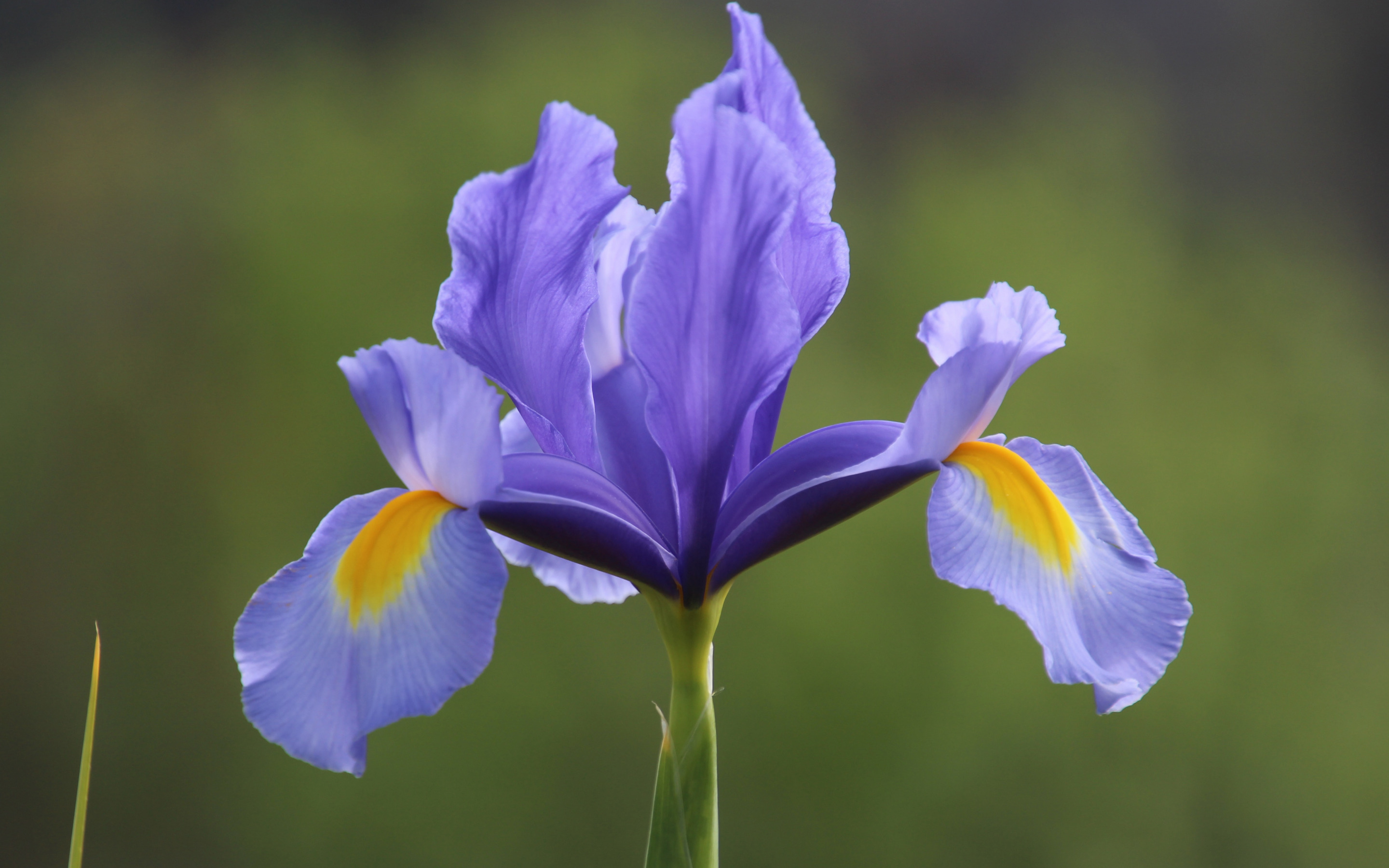 Description: A purple flower with yellow stamens in a field of grass and trees in the background.