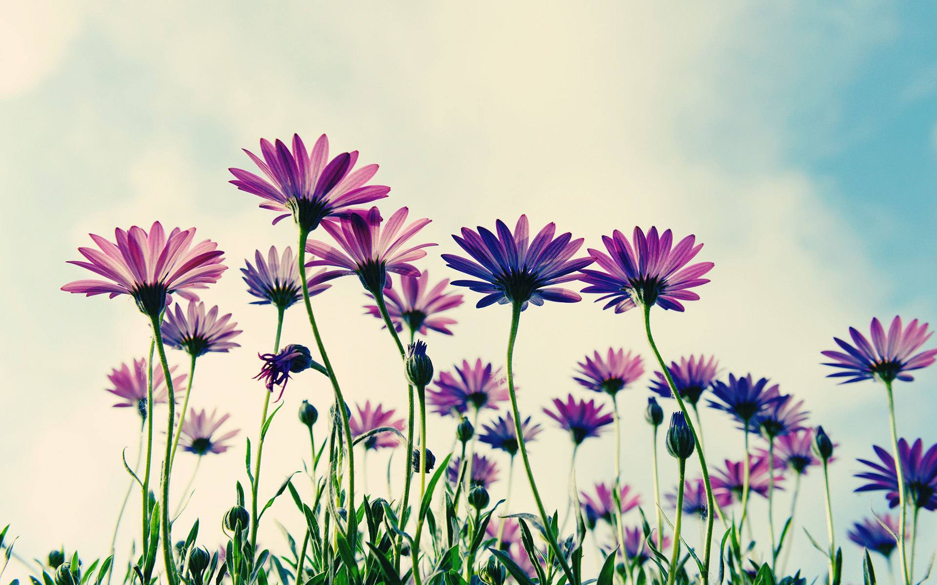 Description: A bunch of purple flowers are in a field with a sky background and clouds in the background.