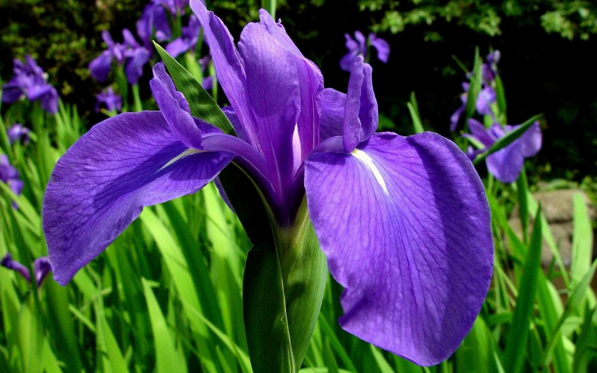 Description: A purple flower is in a field of green grass and flowers are in the background.
