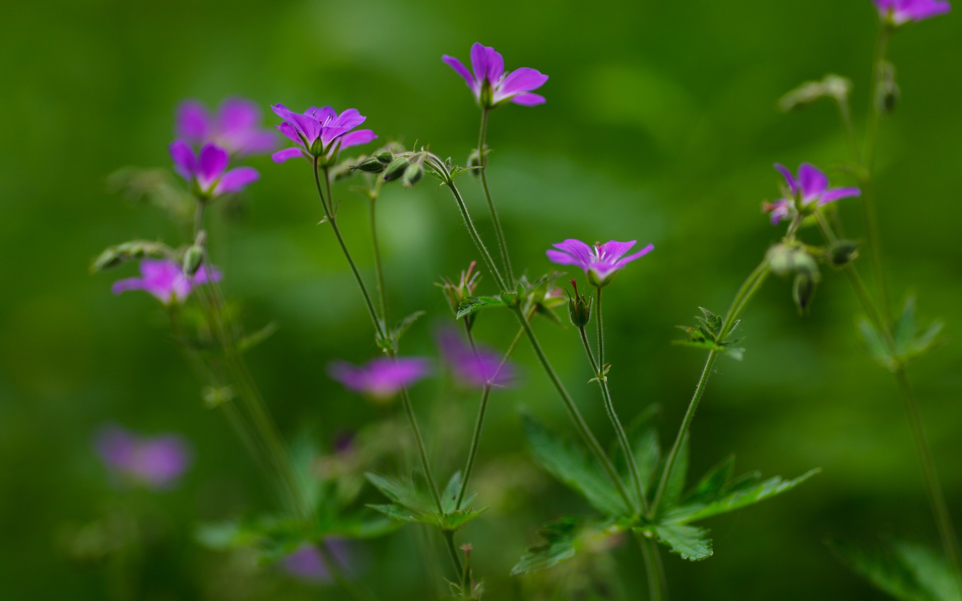 Description: A close up of a bunch of purple flowers in a field of grass and weeds with a blurry background.