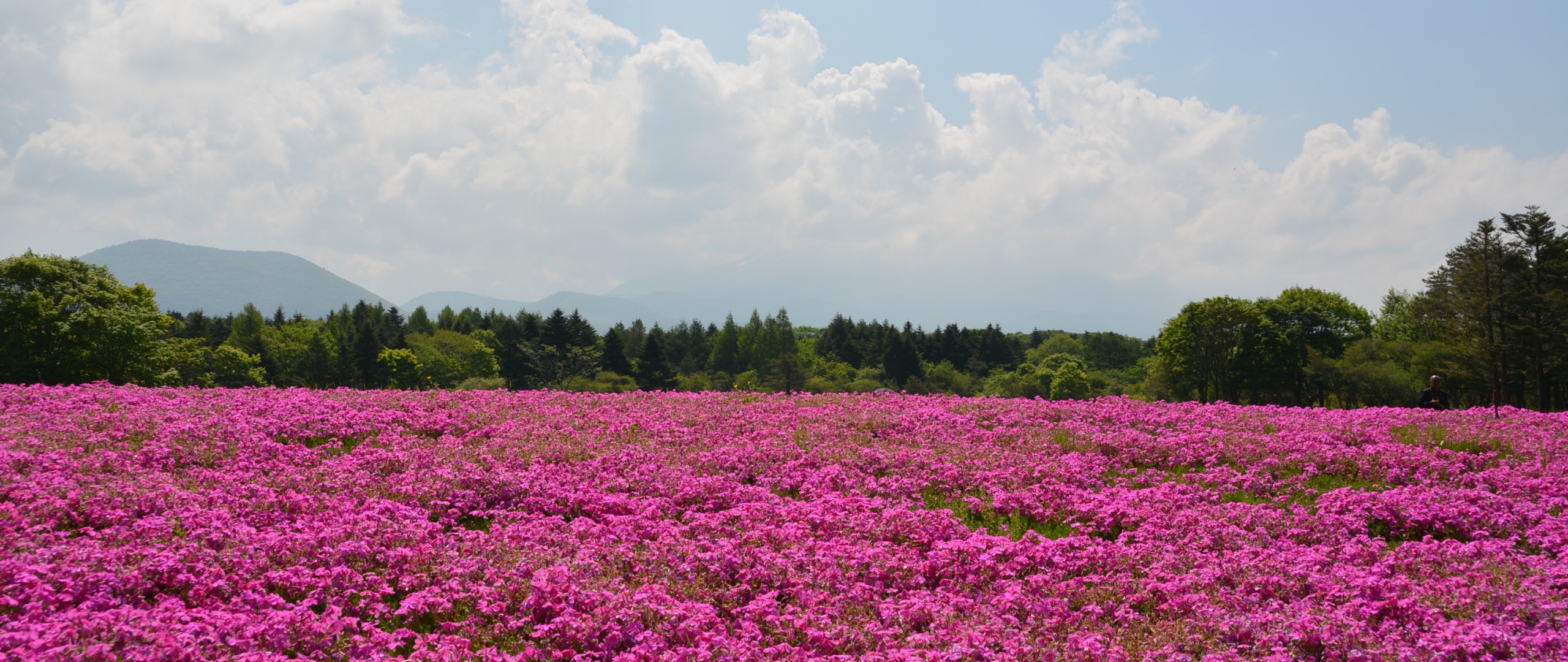 Description: A field of purple flowers with mountains in the background and clouds in the sky above it.