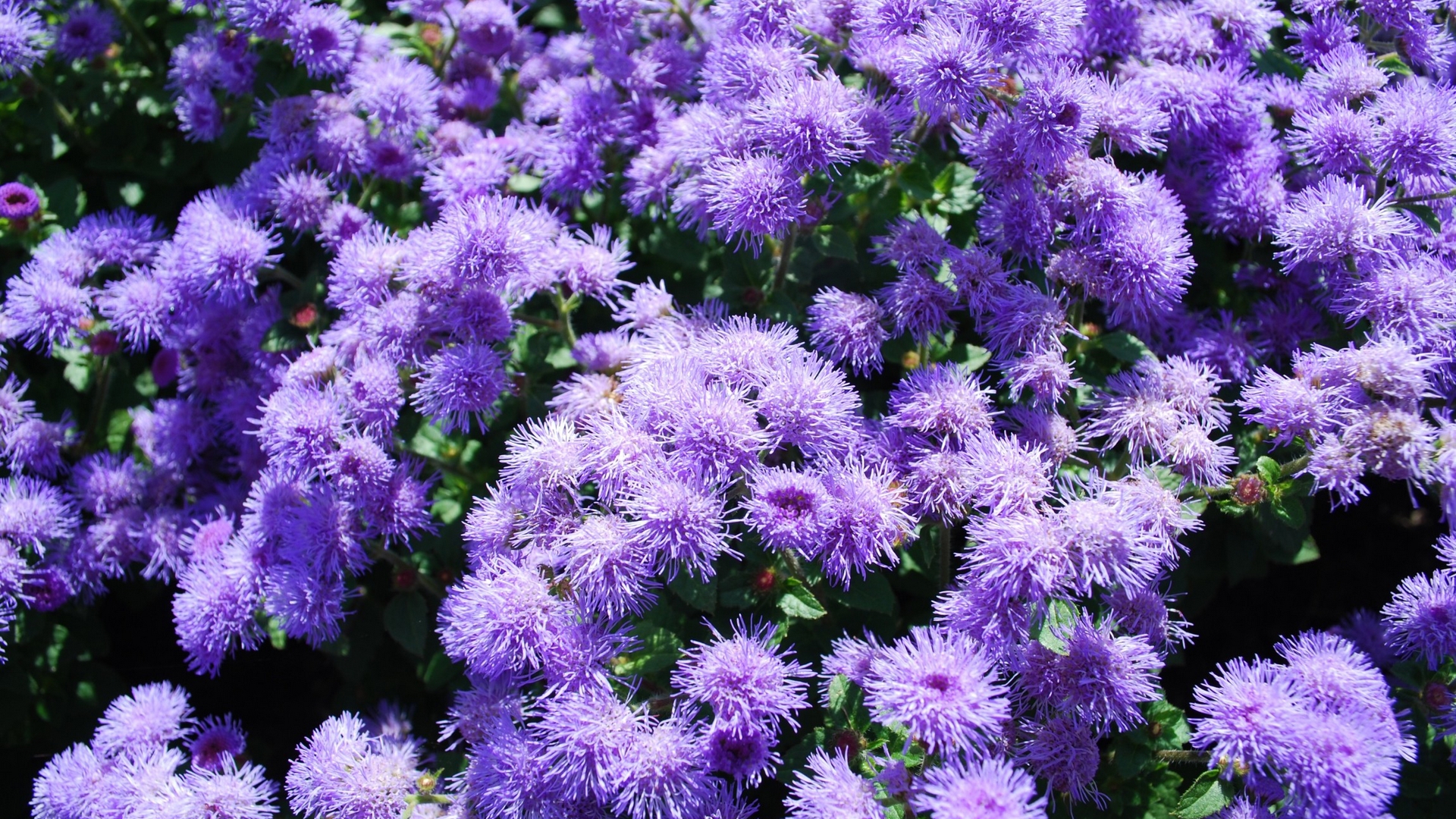 Description: A bunch of purple flowers that are growing together in a garden area with green leaves and a blue sky.