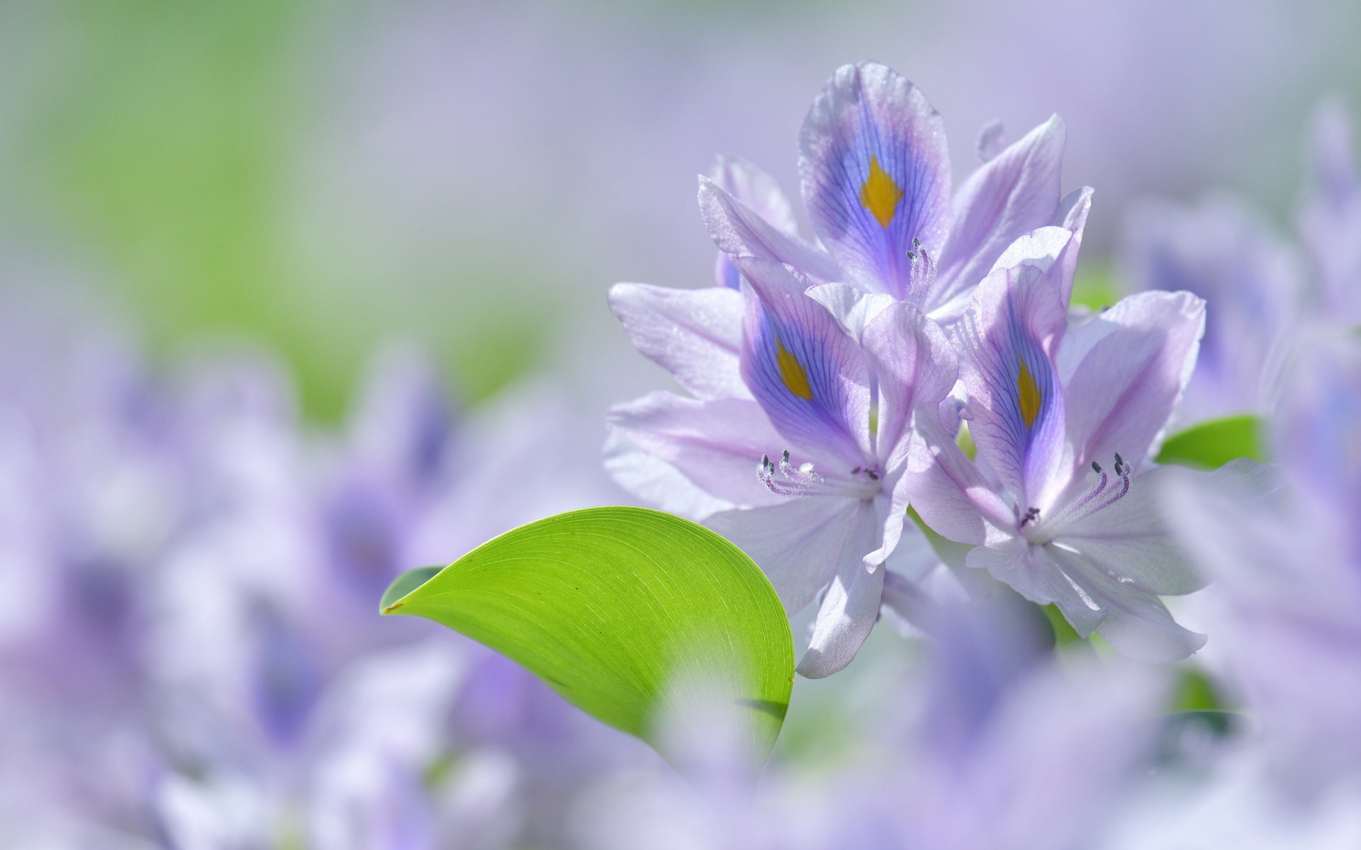 Description: A close up of a purple flower with a green leaf in the foreground and a blurry background.