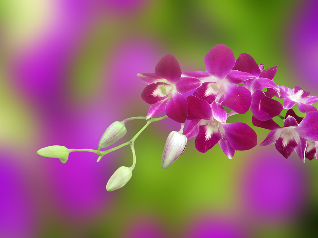 Description: A purple flower with green leaves on a blurry background of purple flowers and green leaves on a branch.