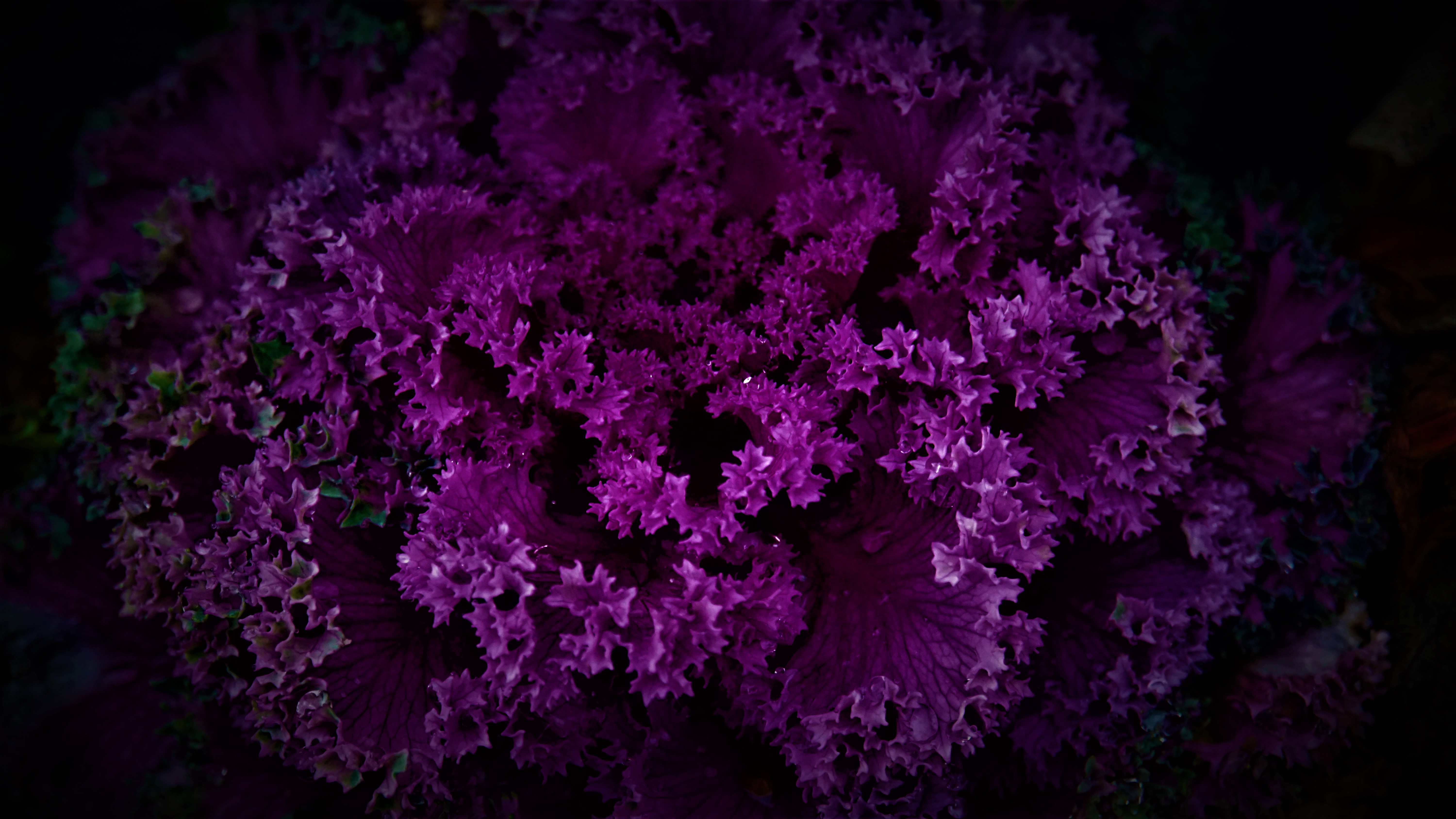 Description: A close up of a purple plant with leaves on it's sides and a black background behind it.