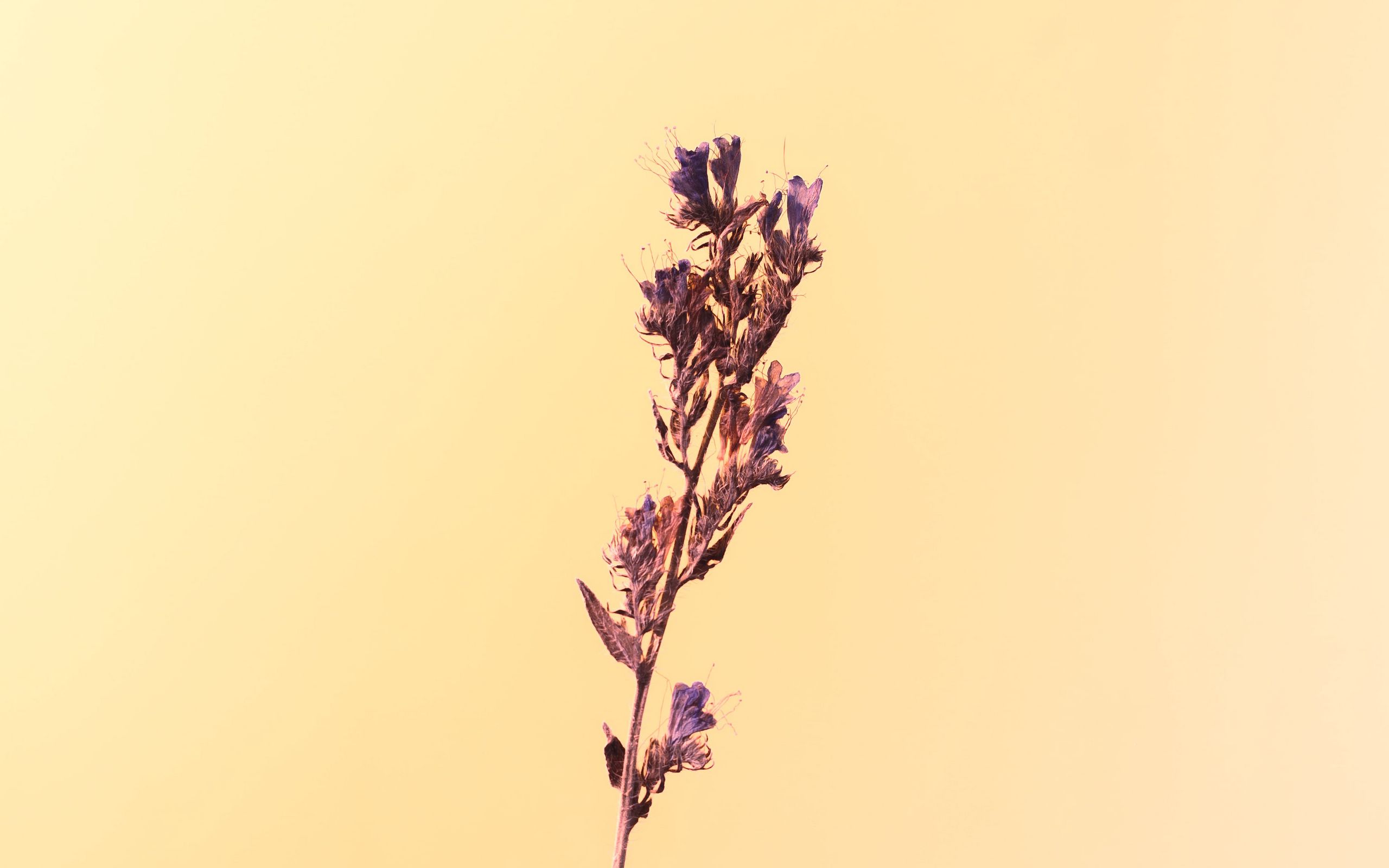 Description: A plant with purple flowers in a vase on a table top with a yellow background and a yellow sky.