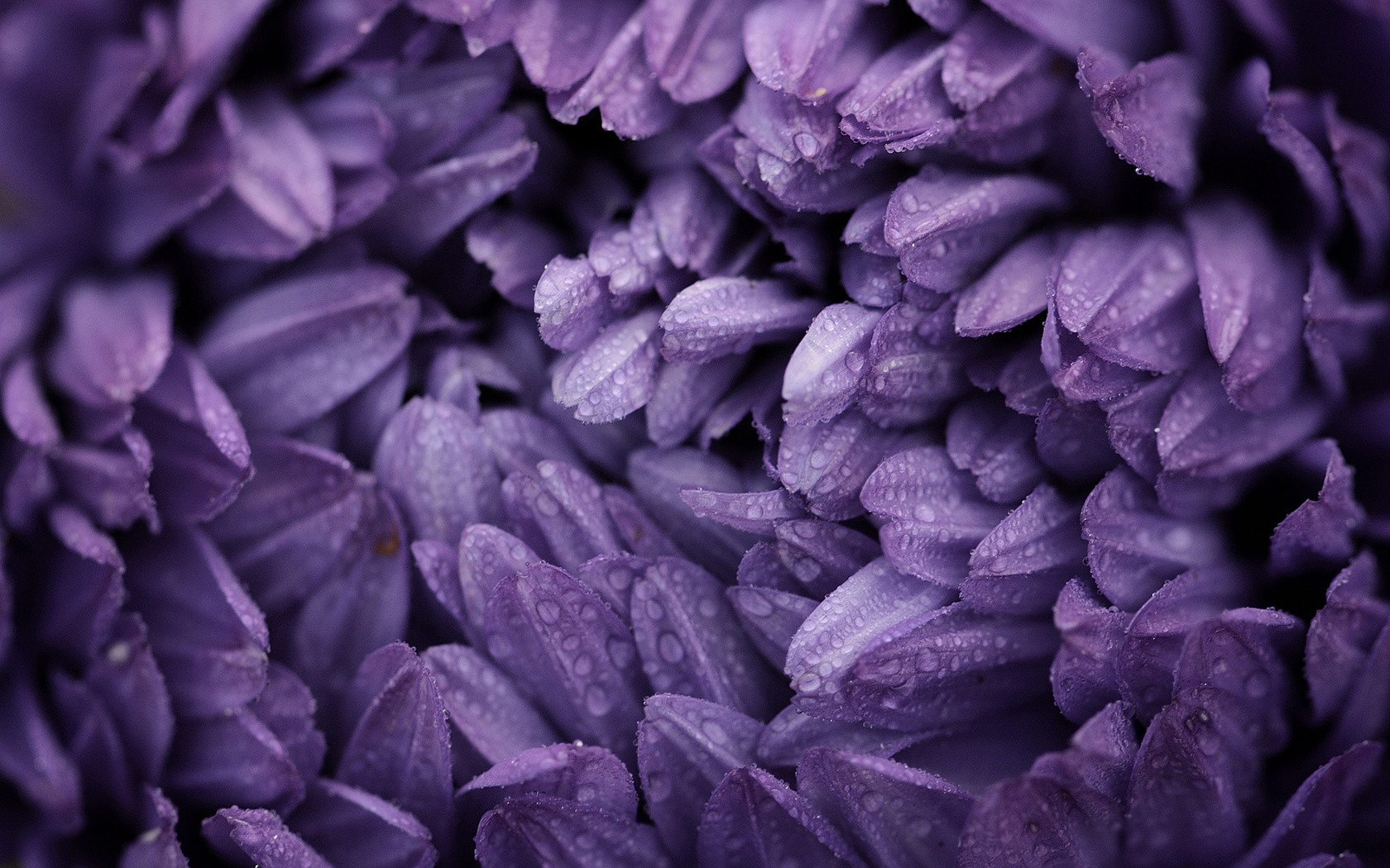 Description: A close up of a purple flower with water droplets on it's petals and leaves.