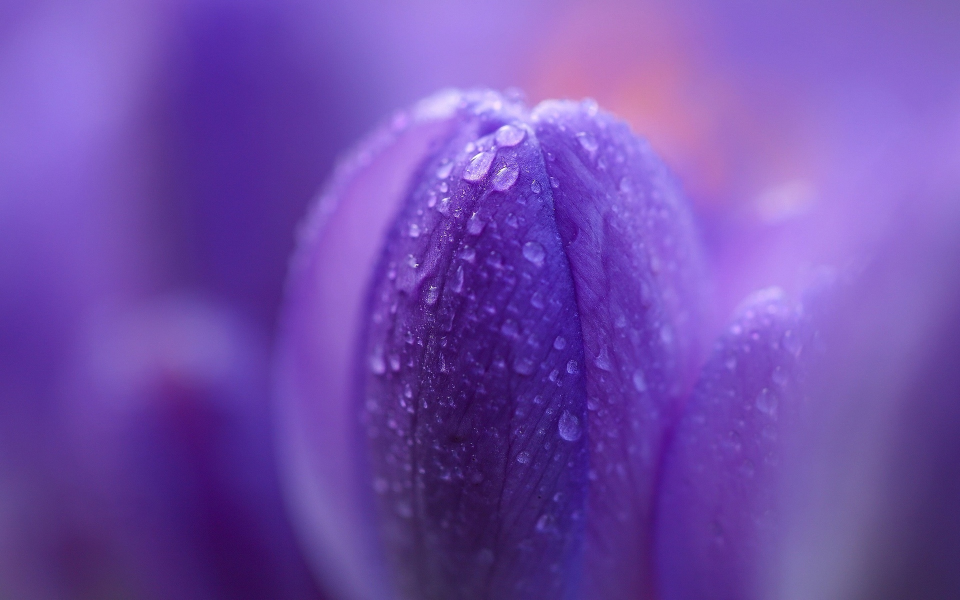 Description: A close up of a purple flower with water droplets on it's petals and the center of the flower.