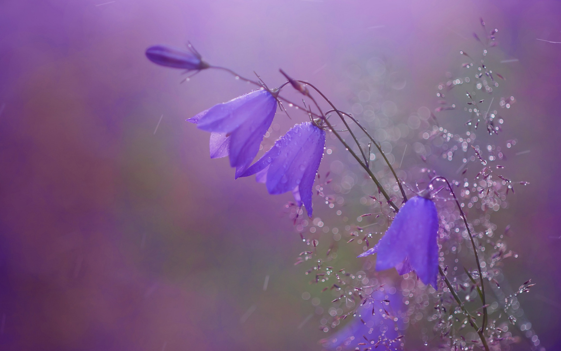 Description: A purple flower with water droplets on it's petals and a blurry background of grass and flowers.