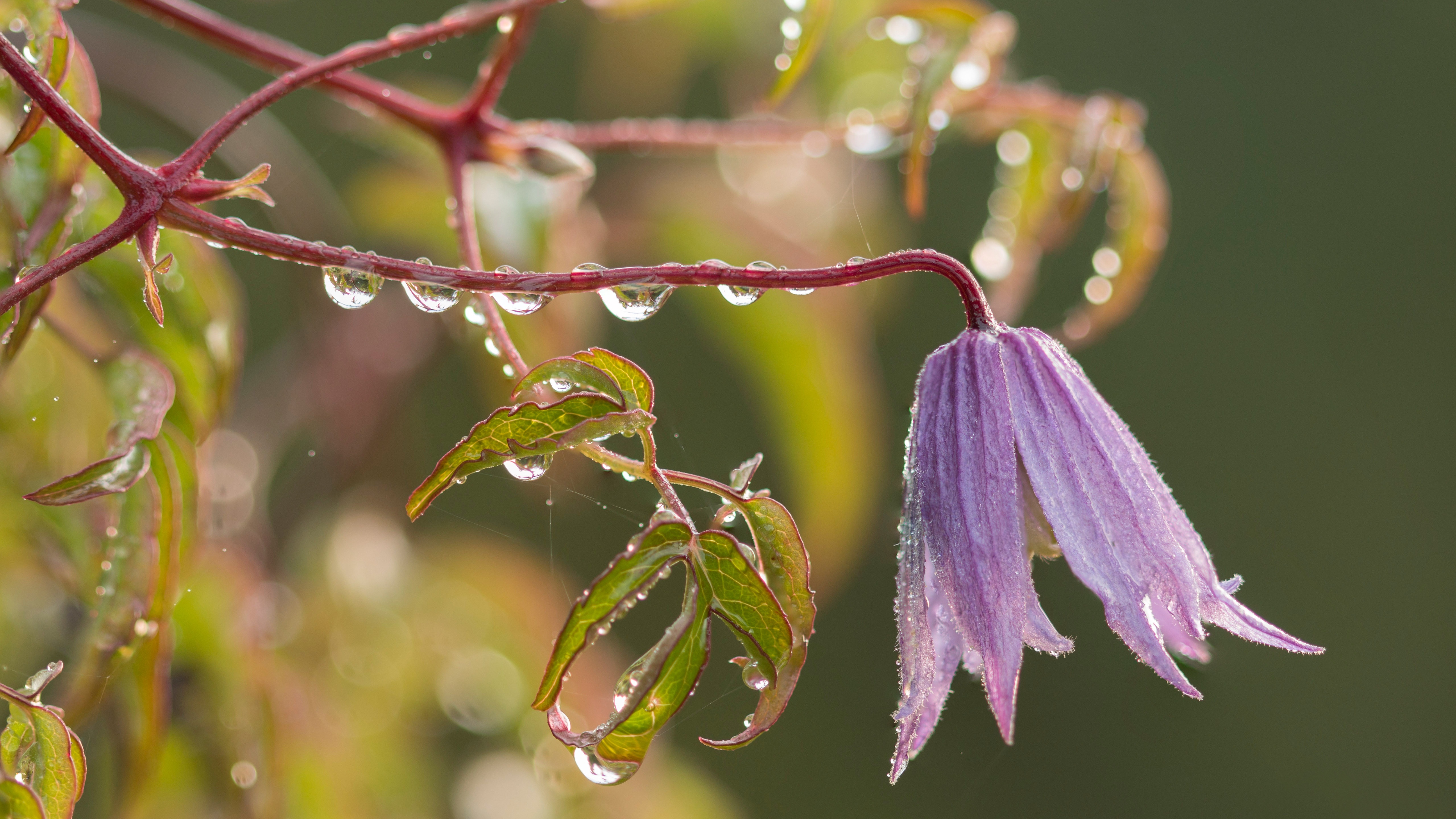 Description: A purple flower with water droplets on it's petals and a branch with leaves and buds on it.